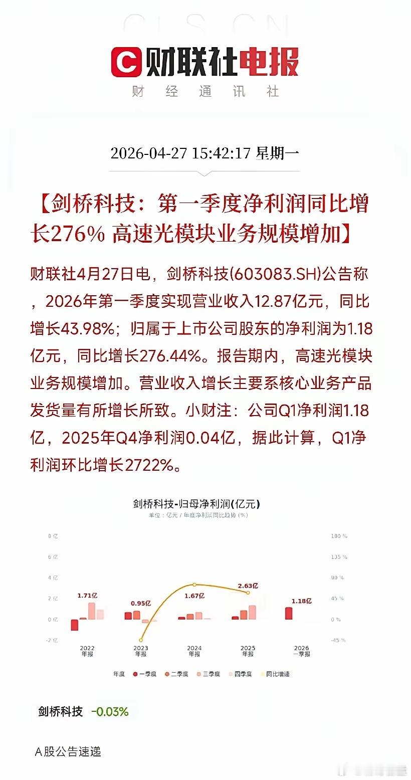 剑桥科技一季报:净利大增276%,环比增长2722%!1.6T光模块,放量前夜今天下午,剑桥科技披露了一季度成绩单。Q1营收12.87亿元,同比增44%;归母净利润1.18亿元,同比大增276%。环比更猛——去年Q4净利润只有400万,Q1一把跳涨2722%。业绩变动主要是高速光模块业务规模增加。但真正值得拆的,不是数字本身,而是它卡在了一个什么样的时间点上。先看剑桥科技手里的牌。2025年全年总营收48.23亿元,同比增32%;归母净利润2.63亿元,同比增58%。高速光模块业务收入16.75亿元,同比大增240.85%,毛利率34.49%,同比提升超10个百分点。Q1的净利润是1.18亿,去年全年是2.63亿。一个季度干了去年全年近一半。技术上,剑桥走的是以硅光为核心的路线。800G硅光模块已实现海外核心客户批量发货;1.6T产品已完成客户送样并进入小批量供货,此前公司在业绩说明会上表示,预计至2026年一季度可实现大量发货,Q1的数据恰好验证了这条放量曲线正在加速兑现。公司在NPO/CPO方向已有技术储备,基于集成硅光引擎和大功率激光技术的NPO/CPO器件已取得阶段性成果,并已经和重要合作伙伴展开XPO等新技术的联合开发项目。剑桥科技Q1这个利润体量,放在行业里是什么水平?光模块龙头中际旭创,Q1净利润57.35亿元,同比增262%,市值破万亿。新易盛Q1净利润33.62亿元,同比增285%,1.6T订单大增。剑桥的1.18亿,在体量上和中际旭创、新易盛差了近两个数量级。1.6T光模块已有部分产品进入小批量供货阶段,但当前营收占比仍低,这一直是市场对它的核心担忧。公司自己也在公告里打过预防针,目前800G及以上高速光模块营收占比仍然偏低,1.6T产品送样后能否获得规模订单存在不确定性。但现在,Q1的利润数据说明,高速光模块的量已经跑起来了。2025年,境外收入占总营收超93%,境外业务主要以外币结算,汇率波动的风险不容忽视。2025年年报披露,全年汇兑损失高达8462万元,仅此一项就占全年净利润约32%。经营性现金流也出现明显恶化——同比增长由正转负,达-4.71亿元,主因规模扩张、备货增加及供应链投入。利润在涨,但现金流在变差,这是一个需要警惕的信号。还有一点:剑桥科技Q4净利润仅剩400万,环比大幅下降,公司在年报中解释的原因是资产减值。但Q1直接干到1.18亿,从400万跳涨到1.18亿——Q4计提的越狠,Q1的反弹就越猛。这种利润报复性反弹,有多少来自一次性因素的消退,未来增长斜率能否持续,是接下来要重点盯住的变量。剑桥科技正处在一个关键时间节点:2024年至2025年是"研发投入期+送样验证期",营收和利润体量都很小;2026年Q1开始,1.6T进入"小批量→批量交付"的加速期,利润曲线开始陡峭化。但它和中际旭创、新易盛之间,还隔着体量和客户结构的差距——能不能在这一轮景气周期里缩小这个差距,决定的是它到底是有业绩的跟跑者,还是真正的第二梯队龙头。