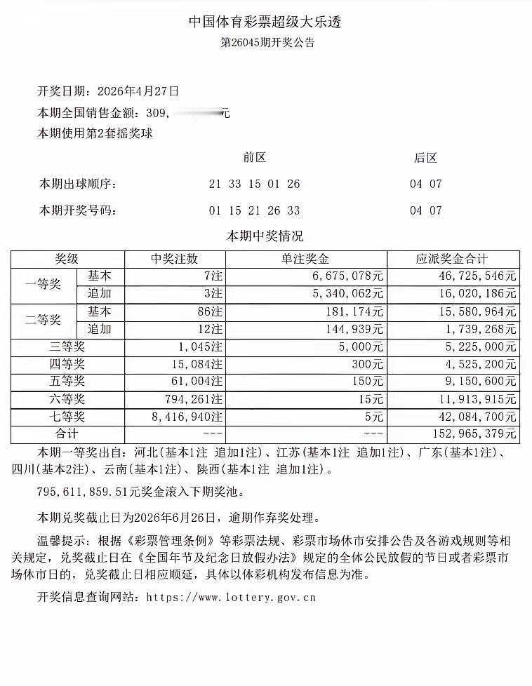 2026年4月27日大乐透如期开奖,全国共中出7注一等奖!这次二等奖也比较丰厚也有181,000元! 大乐透游戏购买人群现在没有双色球的人数多,主要还是现在一等奖有1亿元的封顶机制,导致大乐透的追加玩法买不买都行。 其次是大乐透二等奖单注奖金含量不高,相比较双色球的二等奖单注奖金偏低。要是大乐透再把二等奖的奖金规则改变,将每次奖金提高至30万元以上,这样大乐透购买的人群会更加的多。 各位是怎么看的?欢迎评论区留言。