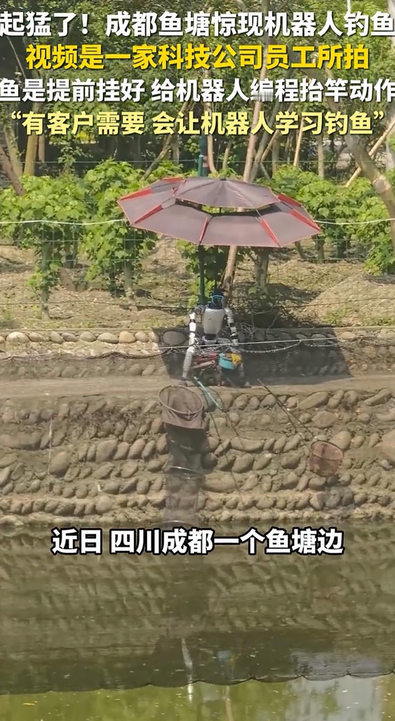 起猛了!四川成都,男子去鱼塘钓鱼,发现对面遮阳伞底下,竟然有一个全副武装的人形机器人,正儿八经地坐在钓箱上钓鱼,旁边鱼护、抄网啥都有,这架势比老钓友还专业。 更绝的是,只见它手臂一抬,还真从水里扯上来一条鱼! 视频一传开,网友都看傻了,以为AI已经进化到能跟大爷们抢鱼获了。 可没想到啊,这其实就是一家搞机器人软件开发的科技公司整的活儿,人家老板自己就是个钓鱼迷,员工就想试一试机器人能不能钓好鱼。 那条鱼啊,是工作人员提前挂好在鱼钩上的,机器人就是按照编好的程序,做了个标准的抬竿动作而已。 公司员工也说了,这就是个专项功能测试,机器人目前可没那本事自己钓鱼。 不过他们也留了个话口,如果有客户需要,将来也能开发让机器人学习真钓鱼的程序。 有网友觉得老板喜欢钓鱼,就想开发机器人钓鱼的功能,这是不是暗示着未来机器人的开发,可能不再只是为了工厂流水线,也可以为了个人的那点小爱好。 说不定以后真能有钓鱼机器人,帮钓友打窝、看漂,解放双手。 仔细想想,人形机器人的终极舞台到底在哪里?是替代重复劳动,还是成为人类生活的延伸? 这次钓鱼测试,更像是一次“探索”。它在试探机器人那双灵巧的手除了拧螺丝、端茶倒水,能不能也干点需要耐心和细微触感的事儿,比如握竿、感知鱼汛。 虽然这次是摆拍,但它指向了一个未来:机器人可能不会取代钓鱼的乐趣,但或许能成为你钓鱼时最得力的“智能助手”。