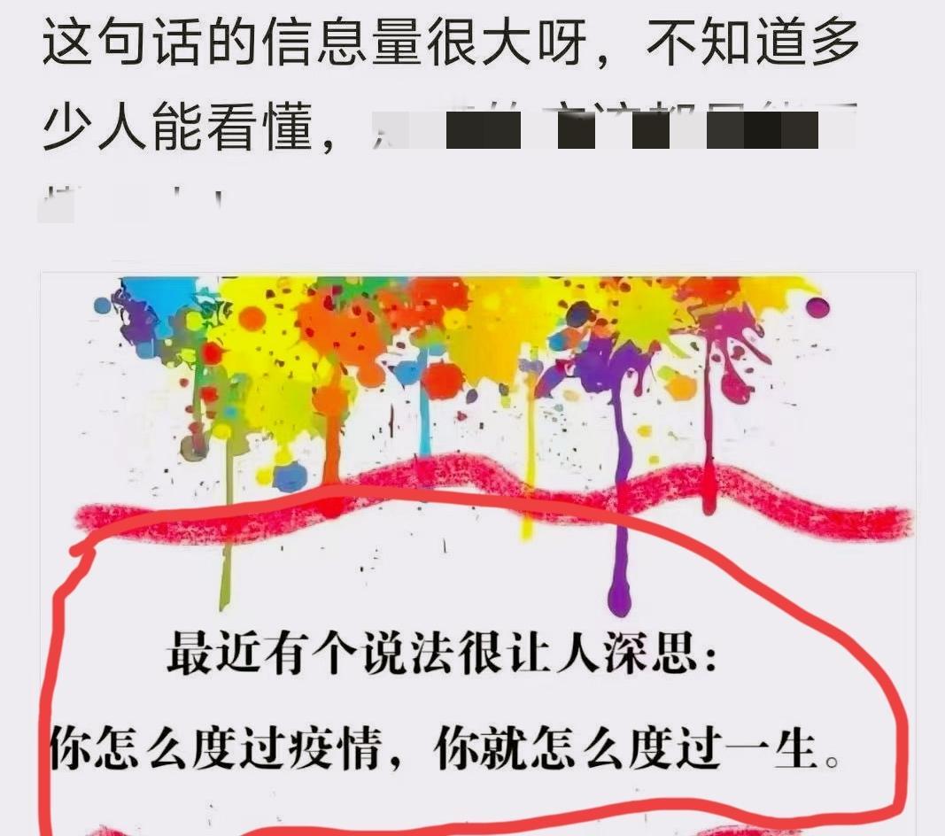 你怎么度过疫情,你就怎么度过一 生。。 你要记住,人这一生最该 学会的本事,从不是拼命挣 钱,也不是打扮自己,而是无 论遇到多大的风雨,都要有 让自己快乐起来的能力。人 来到这个世上,就是来玩儿 的,累了就歇,倦了就逃,没 必要把生活想得那么沉重。 人生是用来体验的,而不是 用来演绎完美的。其实,这个世界本质上就是你一个人的世界,你在,这个世界就在,
