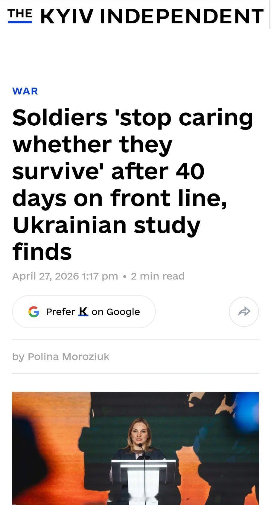 乌克兰《基辅独立报》表示,根据他们的统计研究,乌军士兵只要在战场上存活40天以上,就会变得无所畏惧。