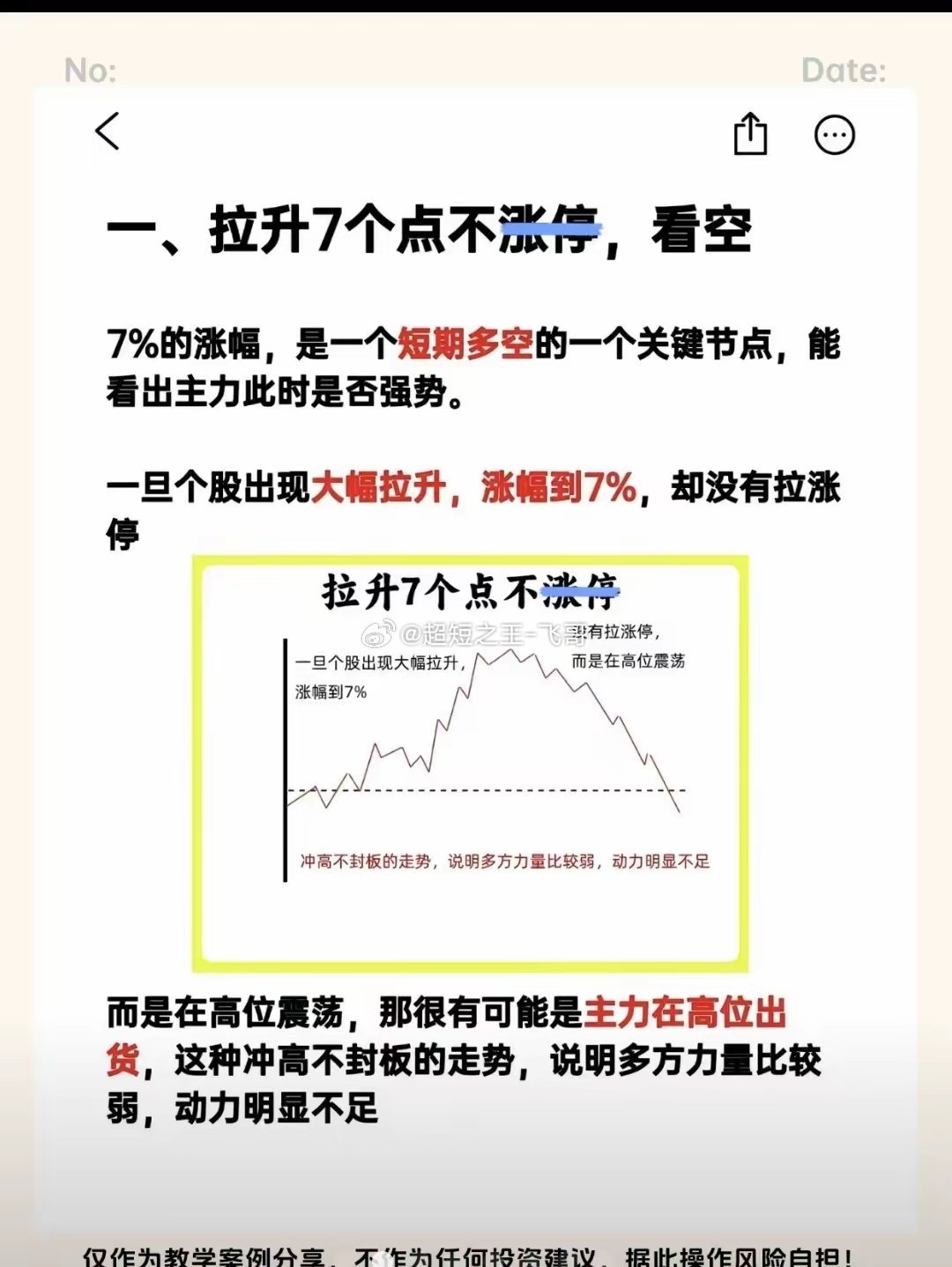 拉升7个点不涨停 → 标准看空信号口诀:拉7不封,大概率诱多,次日必跌。 一、为啥“拉7不涨停 = 看空” 1. 主力真要强攻,直接封板,不会卡在7个点磨蹭2. 拉到7个点不封 = 主力不想花钱封板,只想出货3. 高位追涨资金不敢进,抛压越来越大二、典型走势 - 冲高到 6%~8% 徘徊- 反复冲高,就是不封涨停- 成交量放大,但股价不涨- 尾盘容易回落翻绿或收窄三、实战操作 1. 手里有:逢高减仓/清仓2. 没买:绝对不追3. 次日:大概率低开/下跌四、最强口诀 拉七不封,主力做空;冲高不板,离场为安!