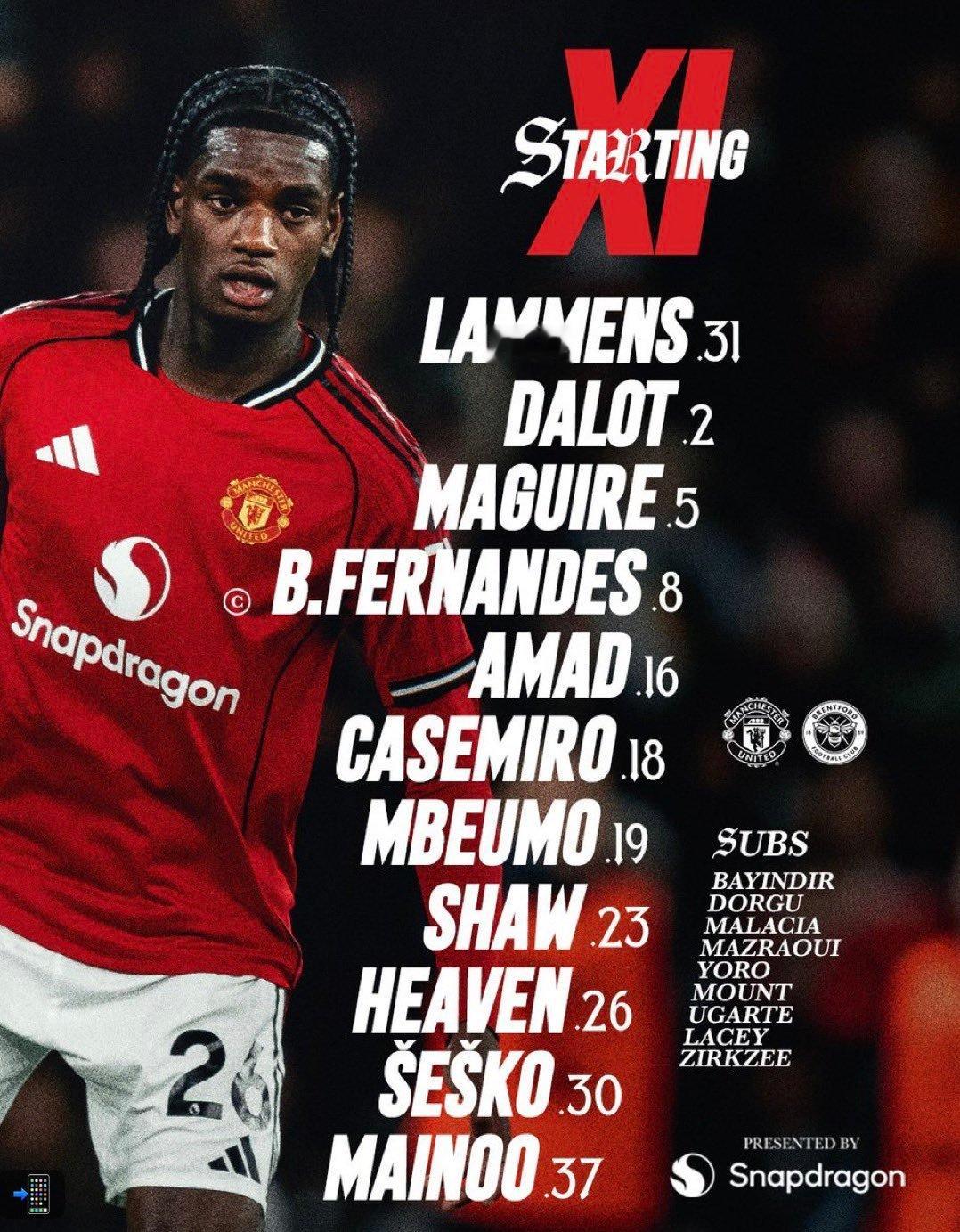 曼联首发:拉门斯,达洛特,马奎尔,B费(C),阿马德,卡塞米罗,姆伯莫,肖,海文,谢什科,梅努;
