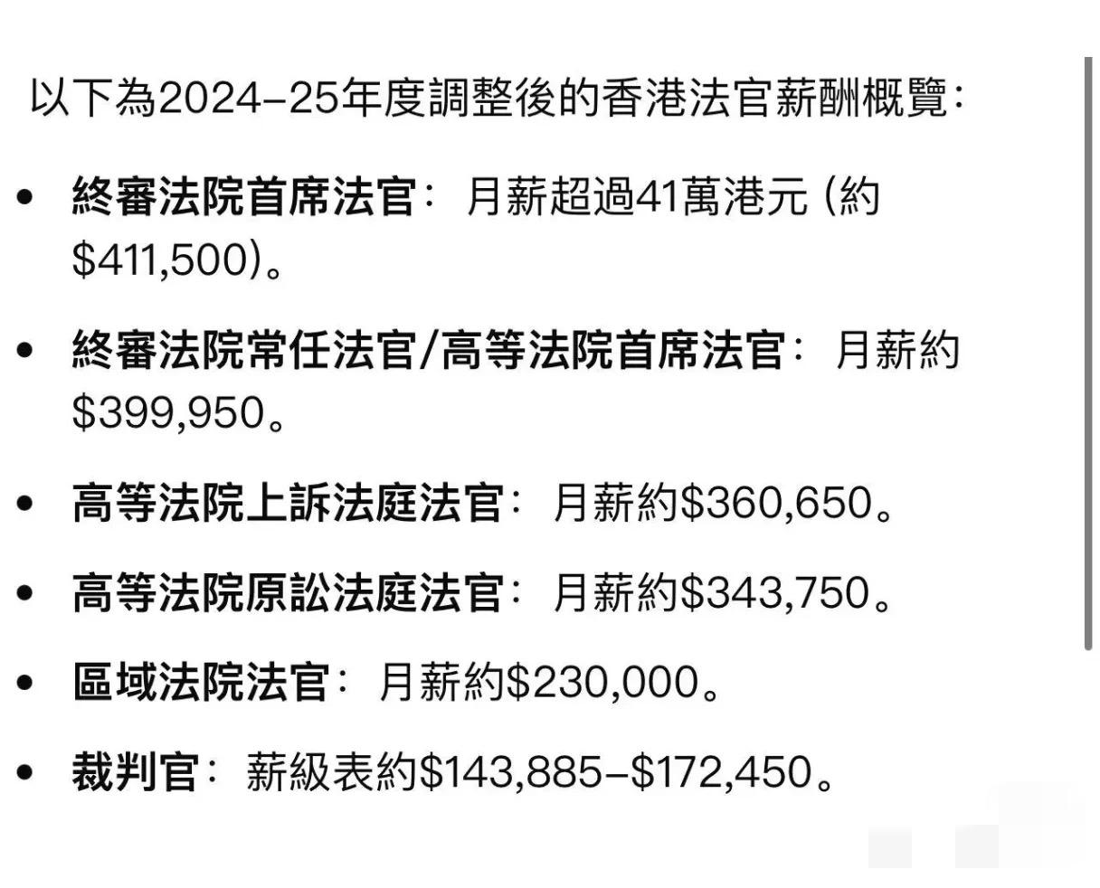 香港法官工资竟然这么高 一直很喜欢香港律政剧,之前还特意打卡过高等法院。最近在家追剧正义女神,感觉里面的法官都住的好,车也好。好奇搜索了一下香港法院的工资标准。真是不搜不知道,一搜吓一跳。 終審法院首席法官:月薪超過41萬港元(約 $411,500)。 終審法院常任法官/高等法院首席法官:月薪約 $399,950。 高等法院上訴法庭法官:月薪約$360,650。 高等法院原法庭法官:月薪約$343,750。 區域法院法官:月薪約$230,000。 裁判官:薪級表約$143,885-$172,450。