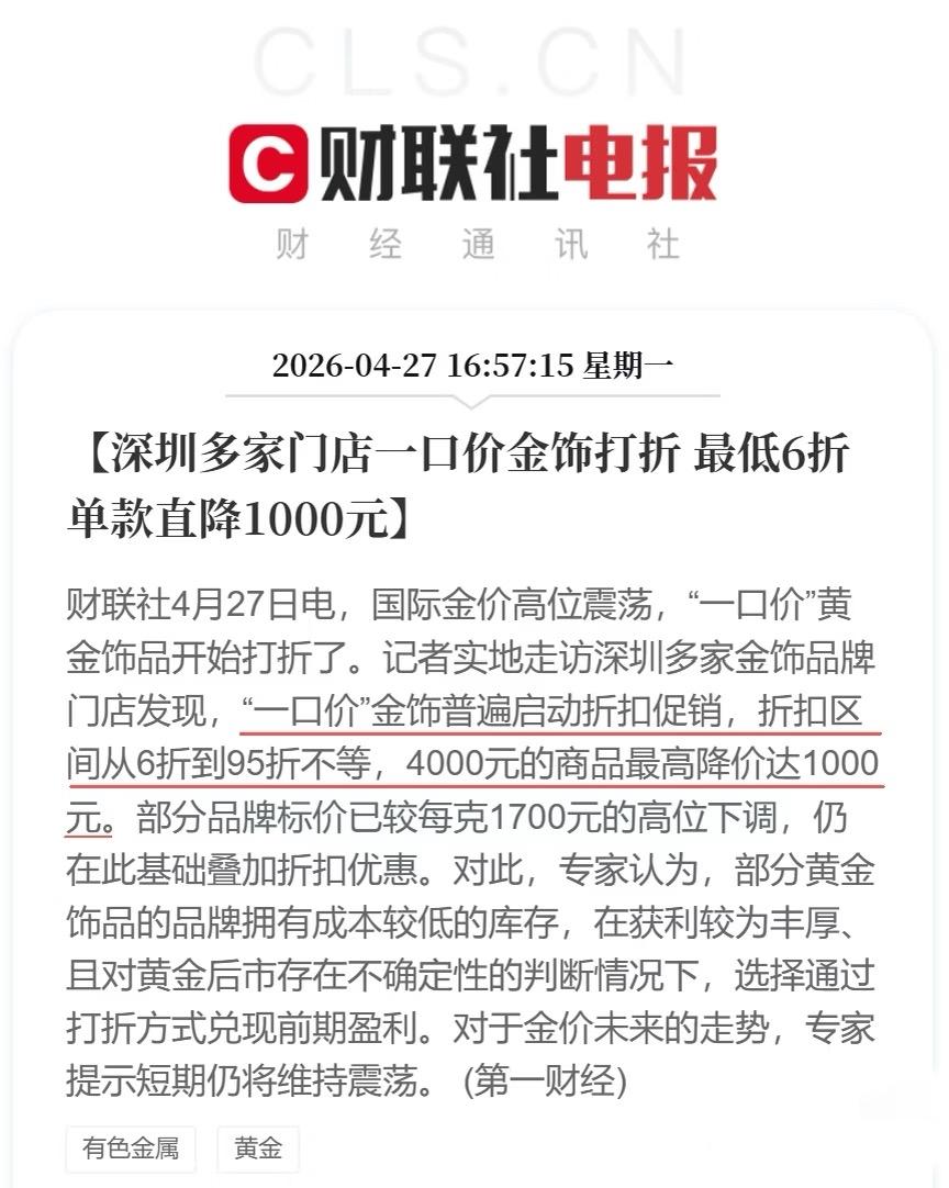 近期深圳多家门店的一口价金饰打折啦,最低能到6折,单款最高直降1000元哦!不过大家要知道,一口价金饰平时可贵了,就像衣服吊牌价打折,看似优惠,实则可能还是不划算,购买时可得多斟酌呀。
