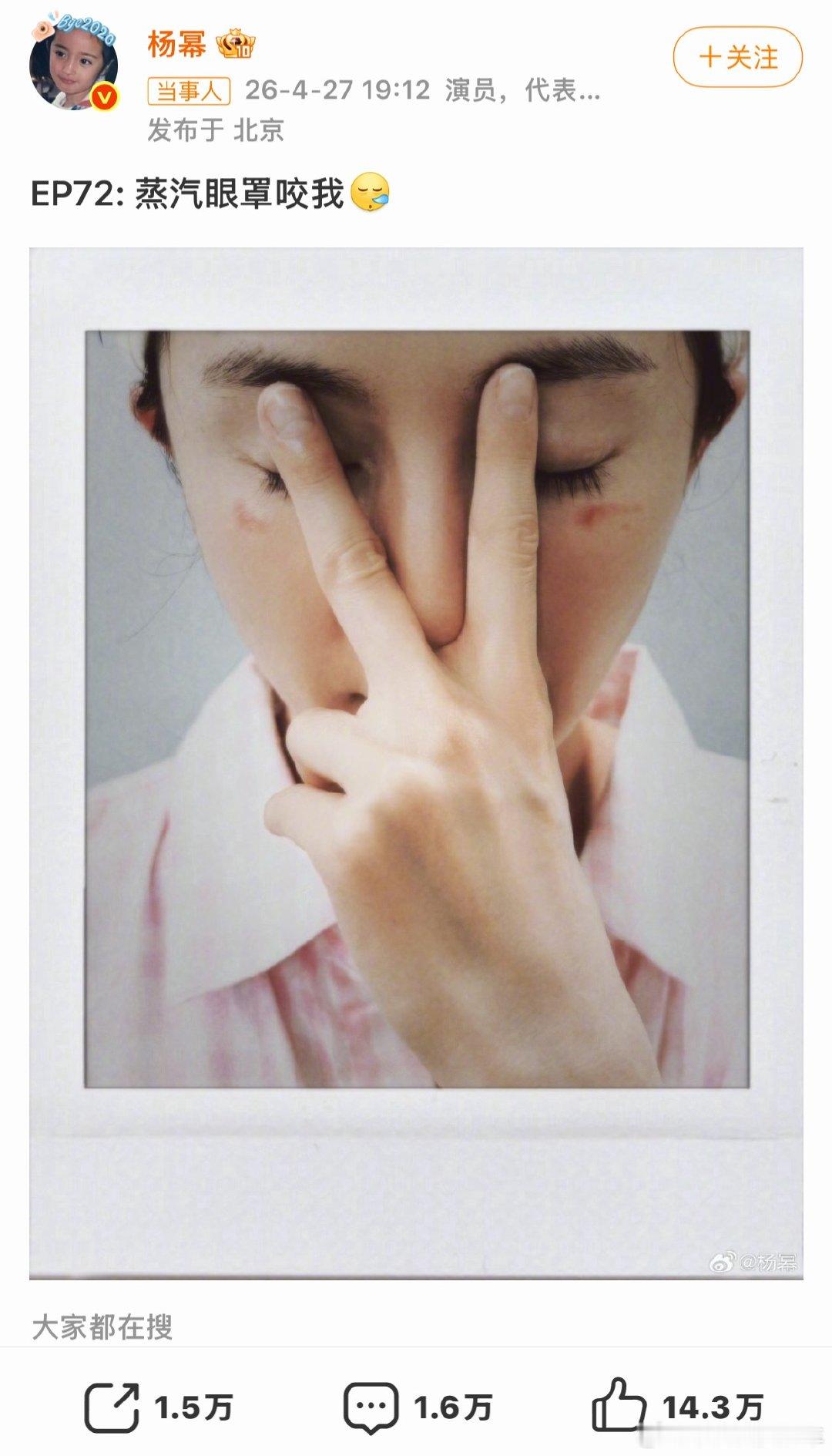 杨幂脸被蒸汽眼罩烫伤了之前我贴暖宝宝,隔着衣服还是把肚子烫出泡了……没想到蒸汽眼罩也是杀手我每天都戴蒸汽眼罩睡有时候还戴蒸汽膝盖贴……感觉自己好危险⚠️