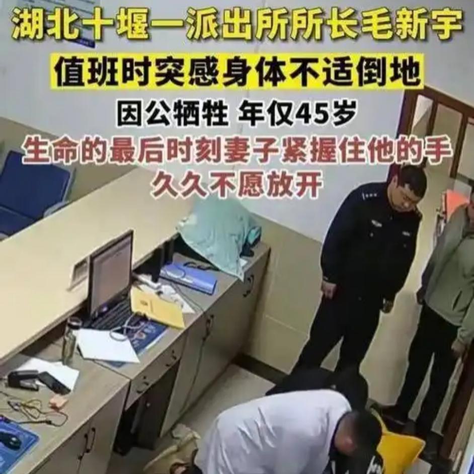 毛新宇真的走了,45岁派出所所长倒在岗位上 湖北十堰45岁民警毛新宇,在派出所值班时突发意外离世,从警整整25年。 他放弃医院工作,从辅警苦熬8年穿上警服,做法医不惧艰险,当所长心系百姓。村民丢10只鸡,他奔波数小时追回;除夕夜,还在帮群众协调赔偿事,事事都把百姓放在心上。 他待同事暖心,一心扎根基层,用一生践行初心。 平凡岗位铸就伟大,这样的好警察怎能不让人敬佩?向他致敬,你被他的故事打动了吗?45岁民警毛新宇