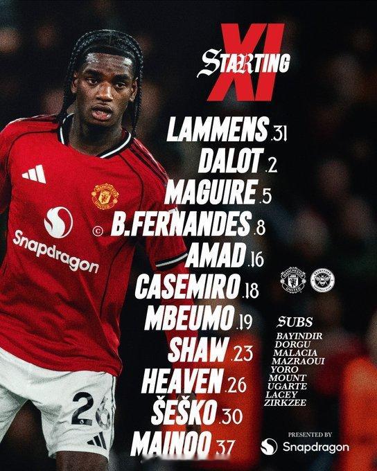 马奎尔结束红牌停赛复出,与海文组成首发中卫搭档。后防线两名伤兵,多尔古和约罗都伤愈复出,进入替补名单,新人边锋莱西也坐上替补席。曼联