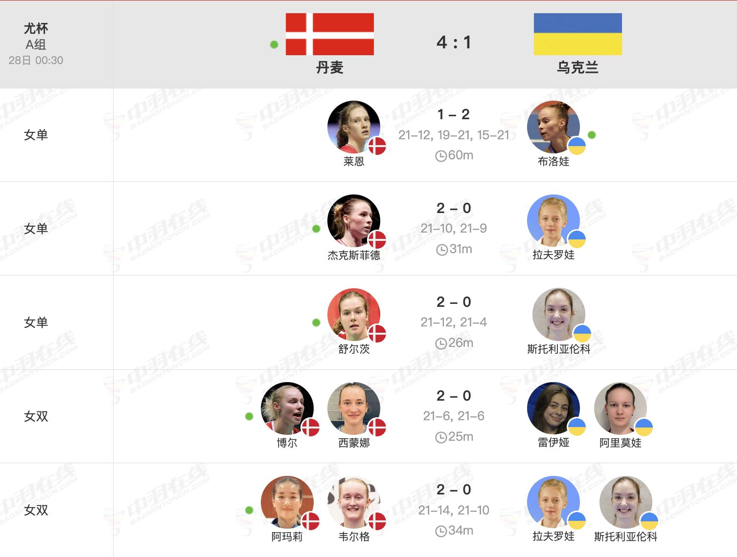 1号场地【尤杯A组:丹麦🇩🇰 4-1 🇺🇦乌克兰】一单:莱恩🇩🇰 21-12、19-21、15-21 🇺🇦布洛娃二单:杰克斯菲德🇩🇰 21-10、21-9 🇺🇦拉夫罗娃三单:舒尔茨🇩🇰 21-12、21-4 🇺🇦斯托利亚伦科一双:博尔/西蒙娜🇩🇰 21-6、21-6 🇺🇦雷伊娅/阿里莫娃二双:阿玛莉/韦尔格🇩🇰 21-14、21-10 🇺🇦拉夫罗娃/斯托利亚伦科巅峰对决胜利在握2026年汤尤杯羽毛球