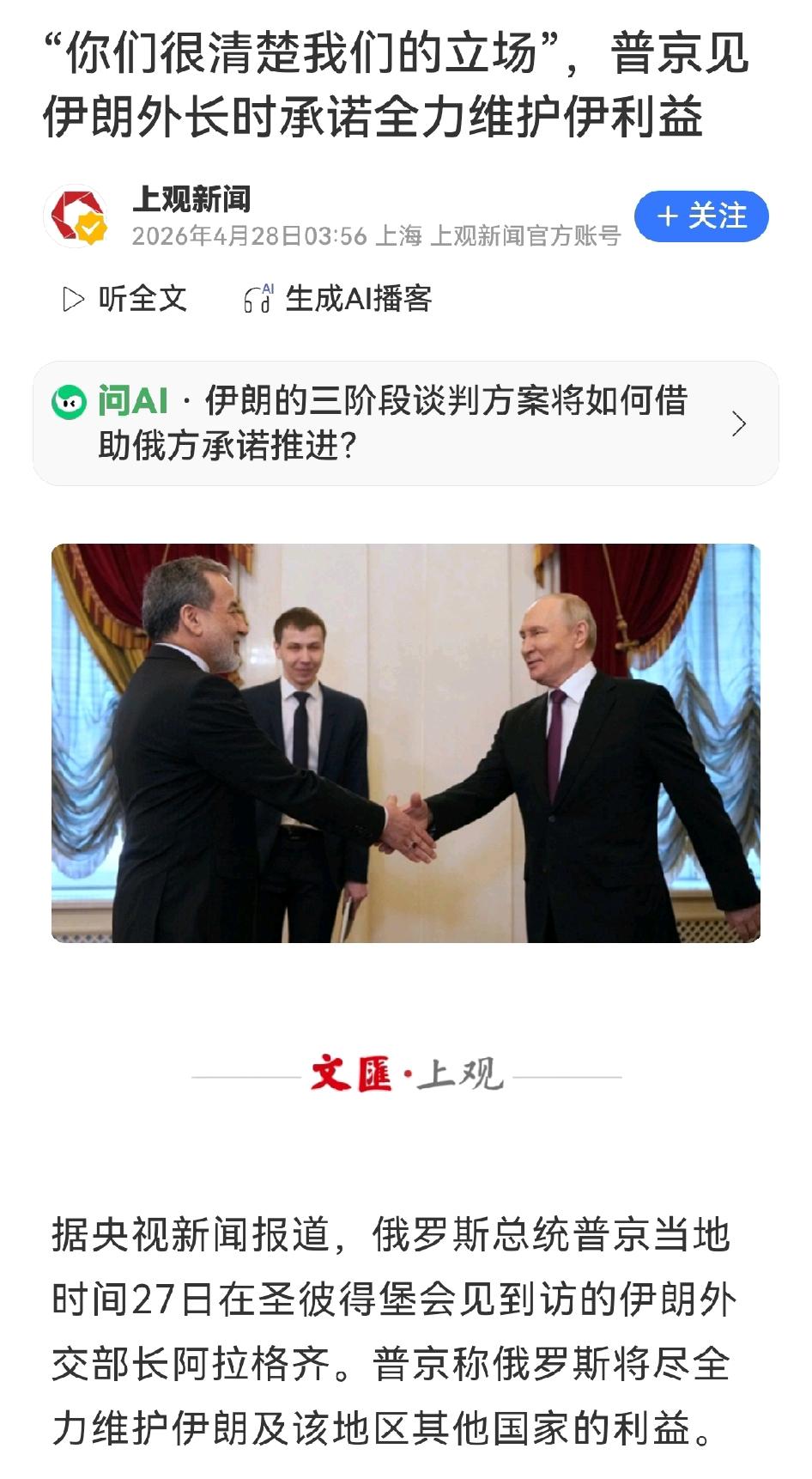 普京在圣彼得堡会见伊朗外长,俄伊战略绑定加深,中东局势和谈与博弈进入新阶段。 俄方明确表态力挺伊朗主权,承诺推动中东和平,外交上坚定站在伊朗一侧,给陷入冲突的伊朗吃下一颗定心丸。双方会谈一个半小时,双边关系和地区局势全被覆盖,战略伙伴关系还会继续强化。 伊朗这边一边靠俄罗斯撑场面,一边主动抛出三阶段谈判方案,把主动权牢牢握在手里。先要求停火求安全,再谈霍尔木兹海峡管理,最后才碰核问题,层层设门槛不松底线。 反观美国,一边把核问题死死咬成红线,一边至今没见拿出什么实质方案。嘴上硬气脚下没动,典型的想占便宜又不愿先低头。美伊双方谁都不肯服软,却又都不敢彻底撕破脸。 俄罗斯的外交力挺、伊朗的强硬谈判策略,再加上美国的犹豫姿态,中东这场博弈远没到落幕的时候,接下来的走向依旧充满变数。