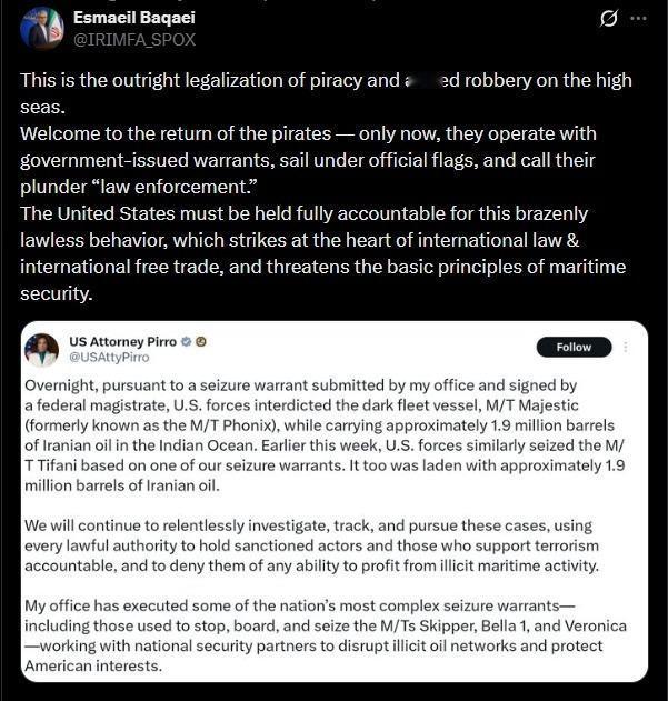 🇺🇸🇮🇷 美国在印度洋扣押了两艘伊朗油轮,这些油轮载有近400万桶石油,距离波斯湾数千英里。 伊朗外交部发言人回应: “欢迎海盗的回归,只是现在,他们持有政府颁发的逮捕令,在官方旗帜下航行,并将他们的掠夺称为‘执法’。” 印度洋的这次扣押意义重大,而华盛顿正在全球范围内追捕伊朗的影子船队。伊朗石油禁令 伊朗紧急运油 中东油轮 伊朗货船遇袭 美军扣押油轮 伊朗号 俄罗斯油轮扣押