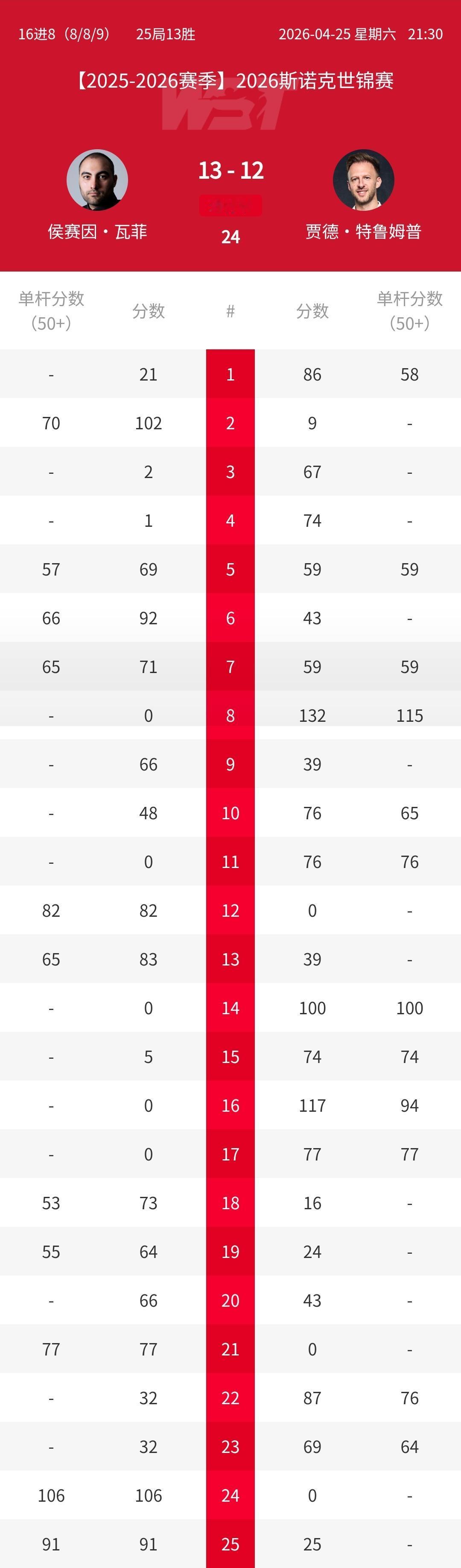 太意外了,伊朗王子绝杀特朗普!2026年斯诺克世锦赛最大冷门出现,世界第一爆冷止步16强。 斯佳辉溃败给瓦菲不冤,伊朗一哥韧劲十足,对阵特鲁姆普前两个阶段7-9落后。 第三阶段打成10-10后,特鲁姆普先拿到赛点,瓦菲11-12落后。随后瓦菲单杆破百逼入决胜局,最终波斯王子顺利上手以13-12绝杀。 特鲁姆普本赛季决胜局10次9输的毛病出来了,这是他本赛季的状态缩影。 明年小特的世界第一估计保不住了,沙特大师赛冠军积分没了,自己也止步世锦赛16强,赵心童萝卜依然还在签表。