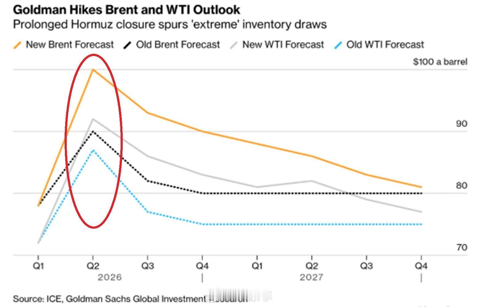 高盛将其布伦特原油2026年第二季度预测上调至每桶100美元,此前估计80美元。
