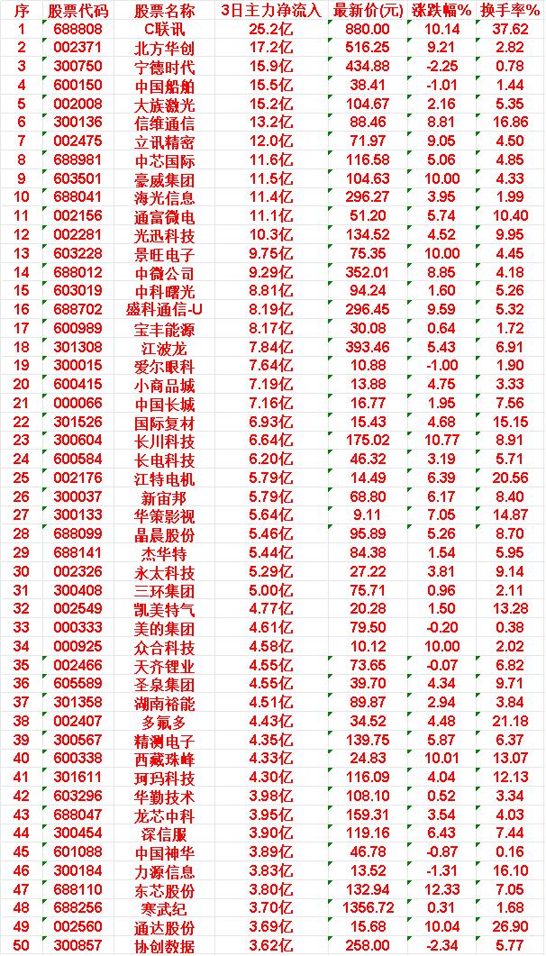 4月28日,前3天主力大幅买入的50名单一览! C联讯:3日主力净流入 25.2亿元,期间股价大涨 10.14%, 北方华创:3日主力净流入 17.2亿元,股价上涨 9.21%, 宁德时代:3日主力净流入 15.9亿元,但股价微跌 2.25%, 中国船舶:3日主力净流入 15.5亿元,股价小幅下跌 1.01%, 大族激光:3日主力净流入 15.2亿元,股价温和上涨 2.16%。 信维通信:3日主力净流入 13.2亿元,股价显著上涨 8.81%。 4月28日,前3天主力大幅卖出的50名-8.17亿 新易盛:3日主力净流出高达 78.4亿元,换手率为 5.29%, 天孚通信:主力净流出 56.1亿元,换手率 4.61%, 中际旭创:主力净流出 55.1亿元,换手率相对较低,为 2.87%, 胜宏科技:主力净流出 53.3亿元,换手率 4.05%。 紫金矿业:主力净流出 39.6亿元,换手率仅 1.12%, 东山精密:主力净流出 33.4亿元,换手率较高,达 6.55%,