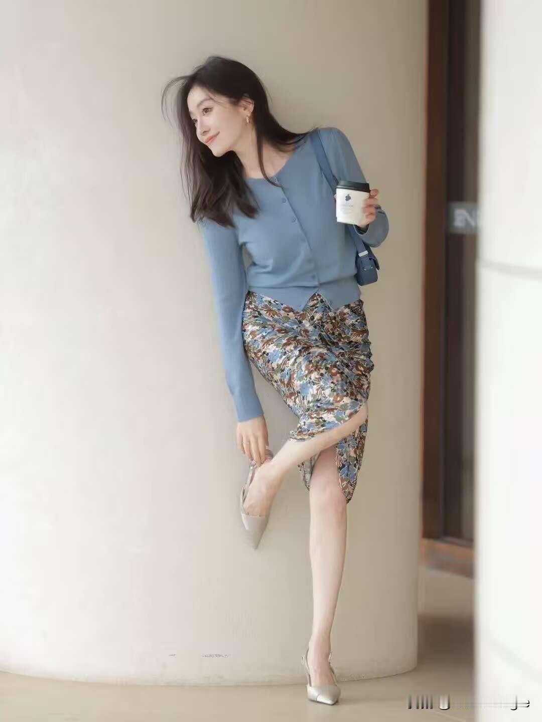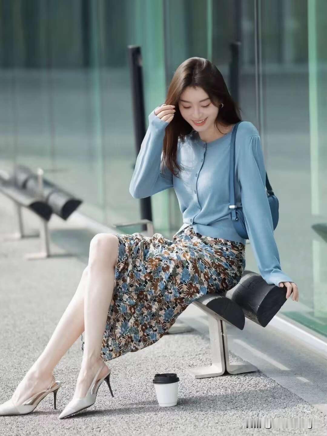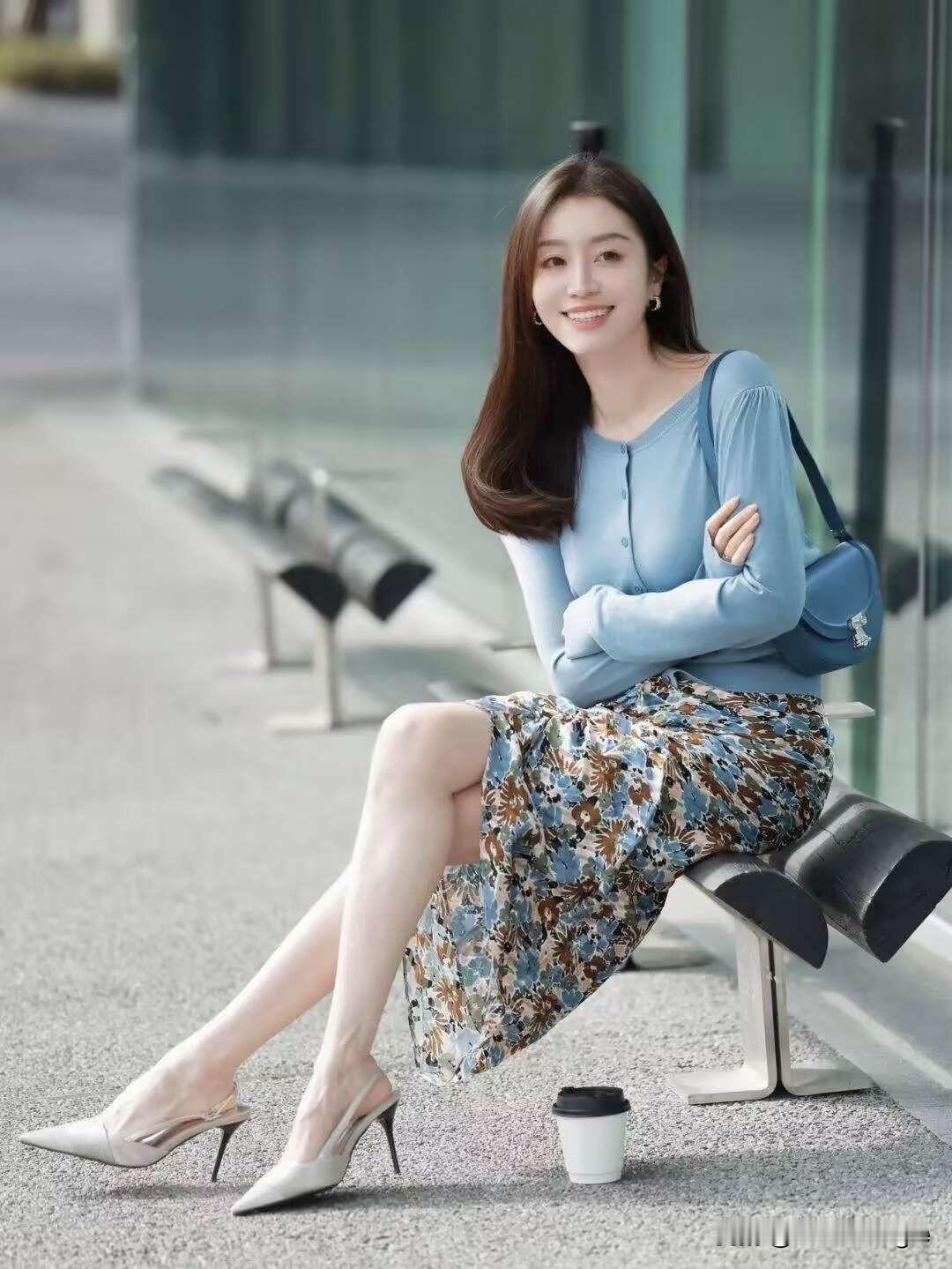 一个漂亮姑娘坐在长椅上,喝着咖啡。