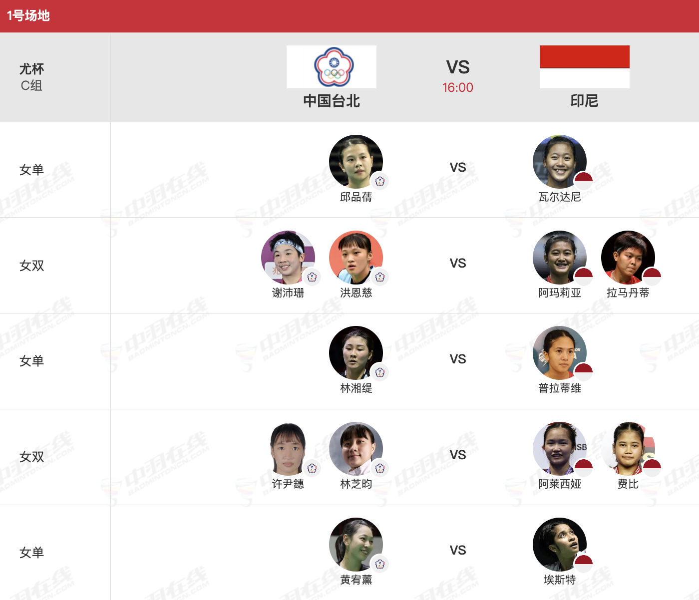 1号场地【尤杯C组:中国台北 vs 🇮🇩印尼】一单:邱品蒨 vs 🇮🇩瓦尔达尼一双:谢沛珊/洪恩慈 vs 🇮🇩阿玛莉亚/拉马丹蒂二单:林湘缇 vs 🇮🇩普拉蒂维二双:许尹鏸/林芝昀 vs 🇮🇩阿莱西亚/费比三单:黄宥薰 vs 🇮🇩埃斯特