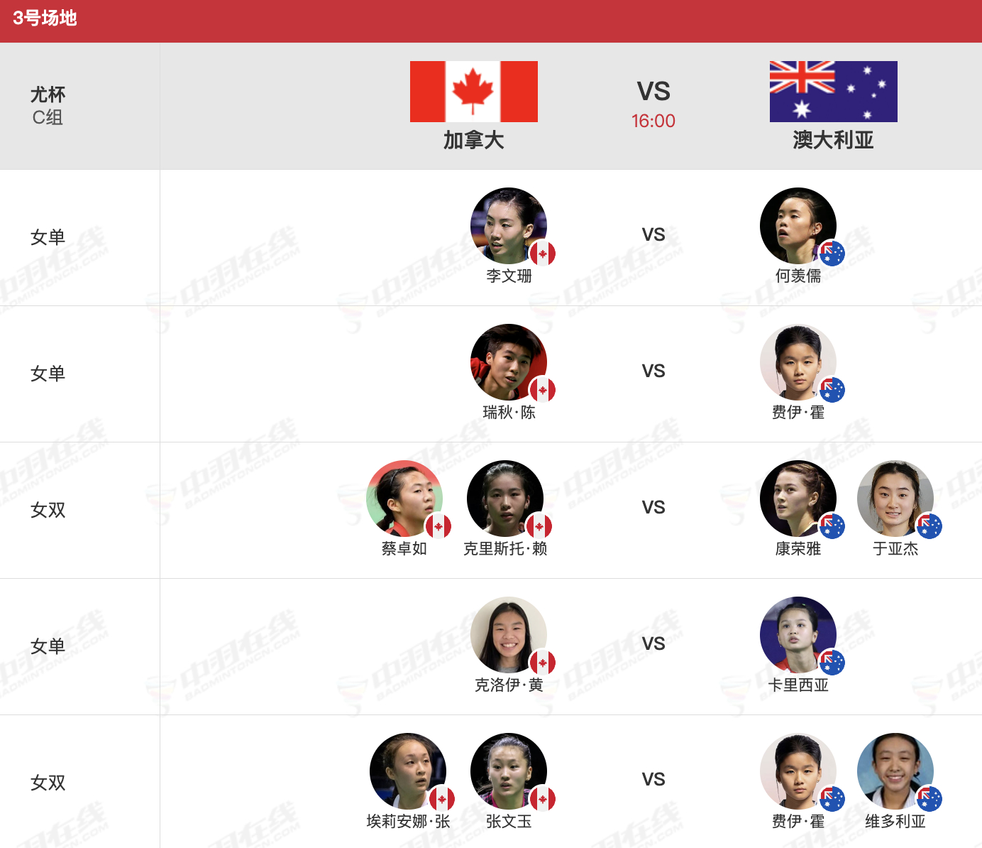 3号场地【尤杯C组:加拿大🇨🇦 vs 🇦🇺澳大利亚】一单:李文珊🇨🇦 vs 🇦🇺何羡儒二单:瑞秋·陈🇨🇦 vs 🇦🇺费伊·霍一双:蔡卓如/克里斯托·赖🇨🇦 vs 🇦🇺康荣雅/于亚杰三单:克洛伊·黄🇨🇦 vs 🇦🇺卡里西亚二双:埃莉安娜/张文玉🇨🇦 vs 🇦🇺费伊·霍/维多利亚巅峰对决胜利在握 羽毛球