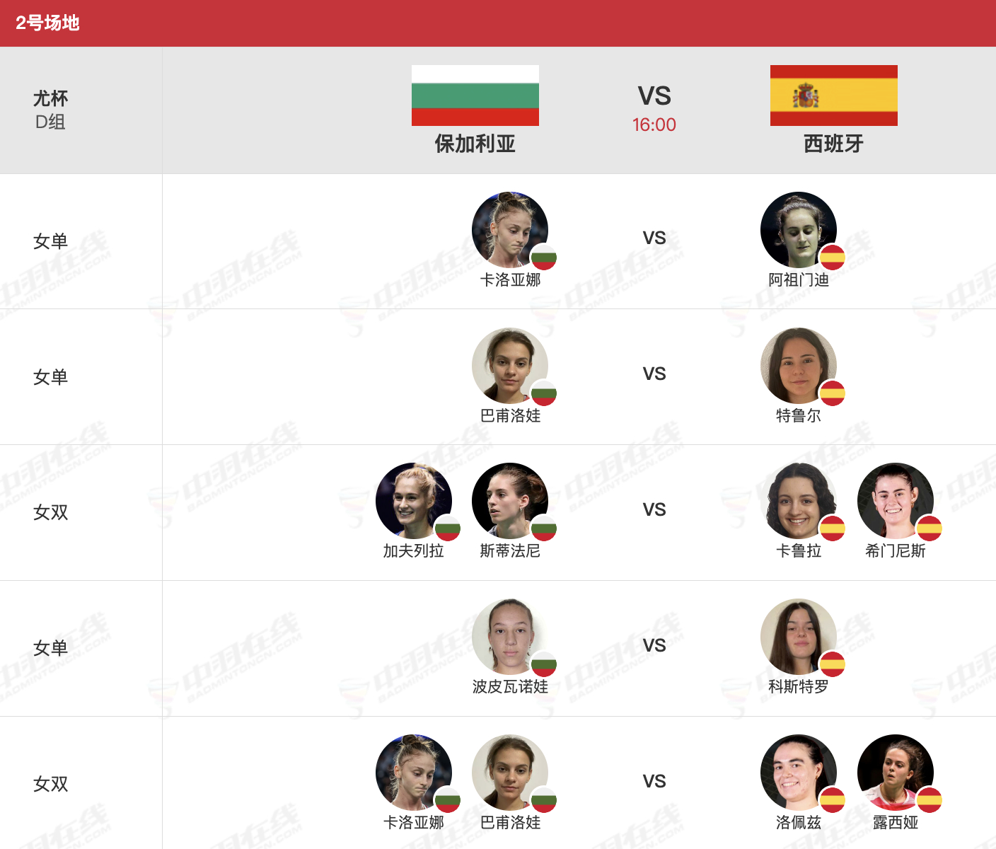 2号场地【尤杯D组:保加利亚🇧🇬 vs 🇪🇸西班牙】一单:卡洛亚娜🇧🇬 vs 🇪🇸阿祖门迪二单:巴甫洛娃🇧🇬 vs 🇪🇸特鲁尔一双:加夫列拉/斯蒂法尼🇧🇬 vs 🇪🇸卡鲁拉/希门尼斯三单:波皮瓦诺娃🇧🇬 vs 🇪🇸科斯特罗二双:卡洛亚娜/巴甫洛娃🇧🇬 vs 🇪🇸洛佩兹/露西娅