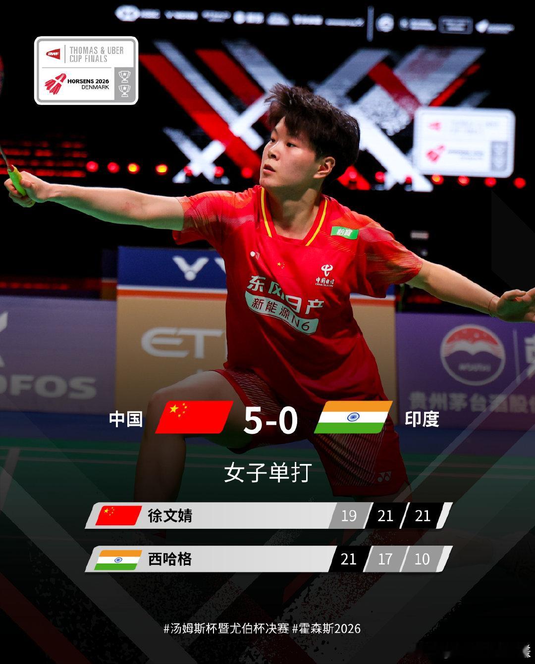 王祉怡21-16、19-21、21-19辛杜刘圣书/谭宁21-11、21-8普里娅/米什拉陈雨菲起22-20、21-13伊沙拉尼罗徐敏/张殊贤10-21、21-12、21-19克拉斯托/塞尔瓦姆徐文婧19-21、21-17、21-10西哈格尤杯中国5比0印度2026年汤尤杯
