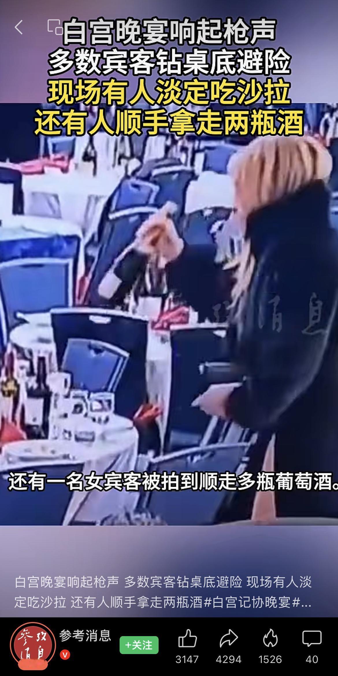 白宫晚宴响起枪声,多数宾客钻桌底避险,现场有人淡定吃沙拉,还有人顺手拿走两瓶酒。 网友评论:顺酒的肯定看过亮剑。 感觉这样也挺好的,不浪费粮食,该吃吃,该喝喝,该拿拿[允悲] 白宫 宴会现场