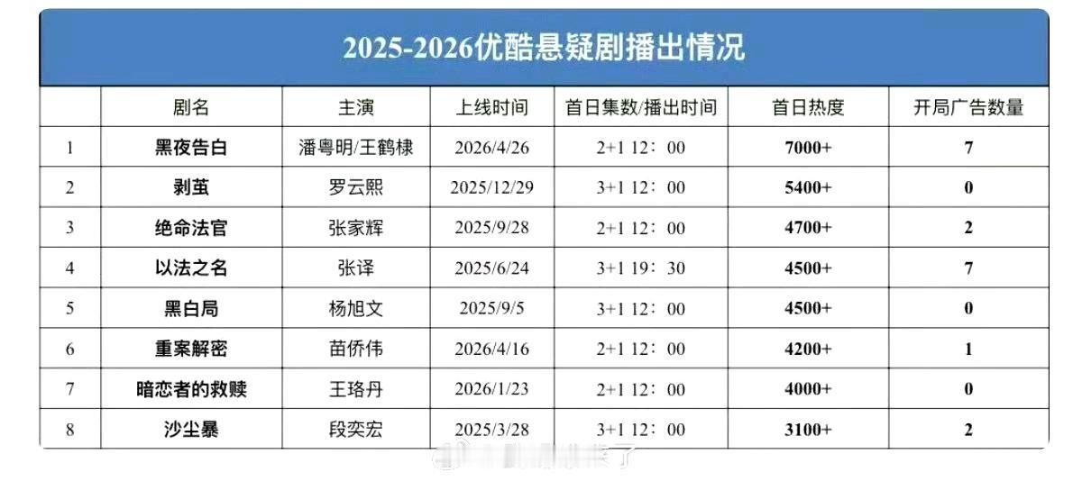 《黑夜告白》作为原创悬疑剧,在优酷无banner推广、首更仅2+1集的不利条件下,剧集首日热度破7000,位列优酷悬疑剧历史第二、近两年第一,开局7个广告。 儒意电影标准制作的精品好剧。