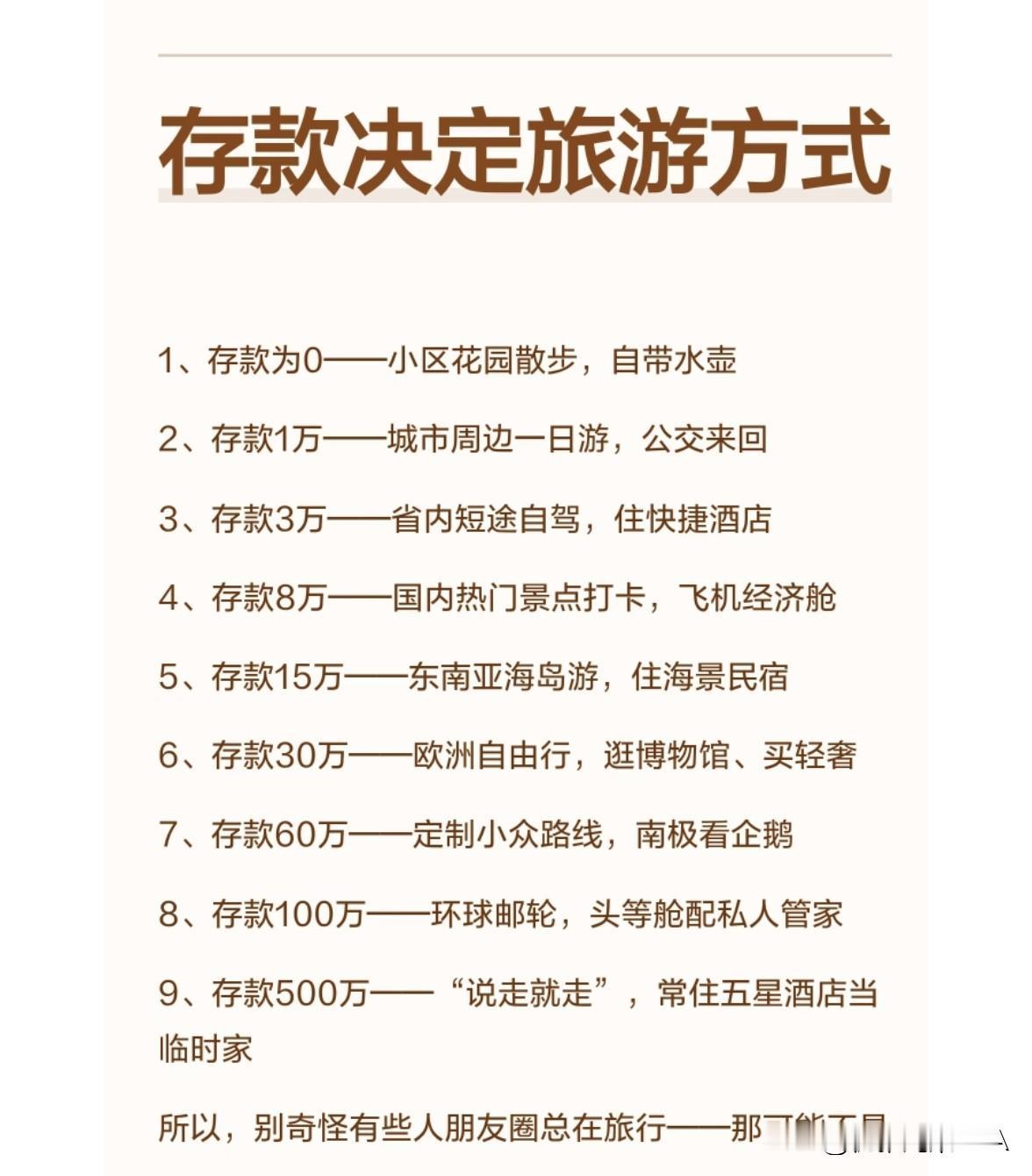 笑不活了!存款多少决定你能浪多远,这分级太扎心又真实☞☞☞ 存款余额直接给旅游划了等级,看完直呼“太真实了”[灵光一闪][灵光一闪][灵光一闪] 存款0元?小区花园溜达一圈,自带凉白开才是标配,步数全靠遛弯凑; 有1万?周边一日游安排上,公交来回主打一个省钱,中午啃个面包继续逛; 攒够3万?省内自驾走起,快捷酒店住得美滋滋,沿途小吃随便炫; 揣着8万?国内热门景点打卡,经济舱也算体验过飞的快乐,民宿选带阳台的; 15万到手?东南亚海岛浪起来,海景民宿拍朋友圈绝了,浮潜项目必须安排; 30万+?欧洲自由行安排,逛博物馆买轻奢,街头咖啡馆坐一下午,假装留过学; 60万往上?南极看企鹅不是梦,小众路线逼格拉满,回来能跟人吹一年; 100万+?那叫“说走就走”,环球邮轮配私人管家,头等舱躺平看世界,行李都不用自己拎; 500万+?五星酒店常住当临时家,今天巴黎喝下午茶,明天东京逛市集,羡慕哭! 所以别酸人家朋友圈天天旅行——可能不是爱浪,是真有底气啊! 你现在的存款,能解锁哪级旅游?评论区聊聊,我先蹲个南极搭子(做梦版)~ 存款与旅游