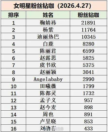 女明星粉丝钻咖排名,鞠婧祎稳稳第一。