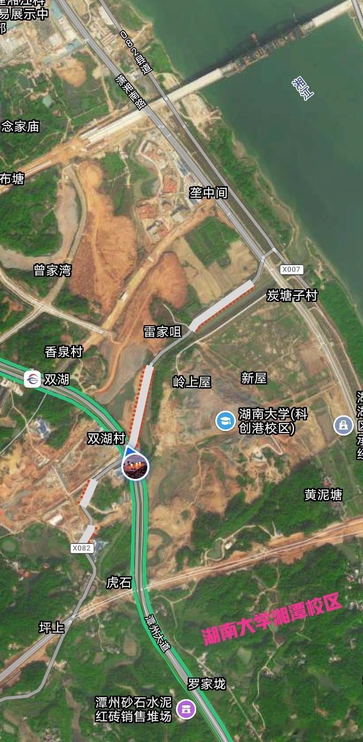 湘江科学城成了好大一个工地! 从湘潭刚跨入长沙,就看到对面的高楼,那里是双湖家园,以及湖南大学科创港校区。 从高德地图上可以看出,长沙与湘潭交接界处,长沙这边已经呈现出大开发的状态。 而湘潭这边,湖南大学湘潭校区还处于待开发的情况,长沙与湘潭的无缝连接,要靠湖南大学了。