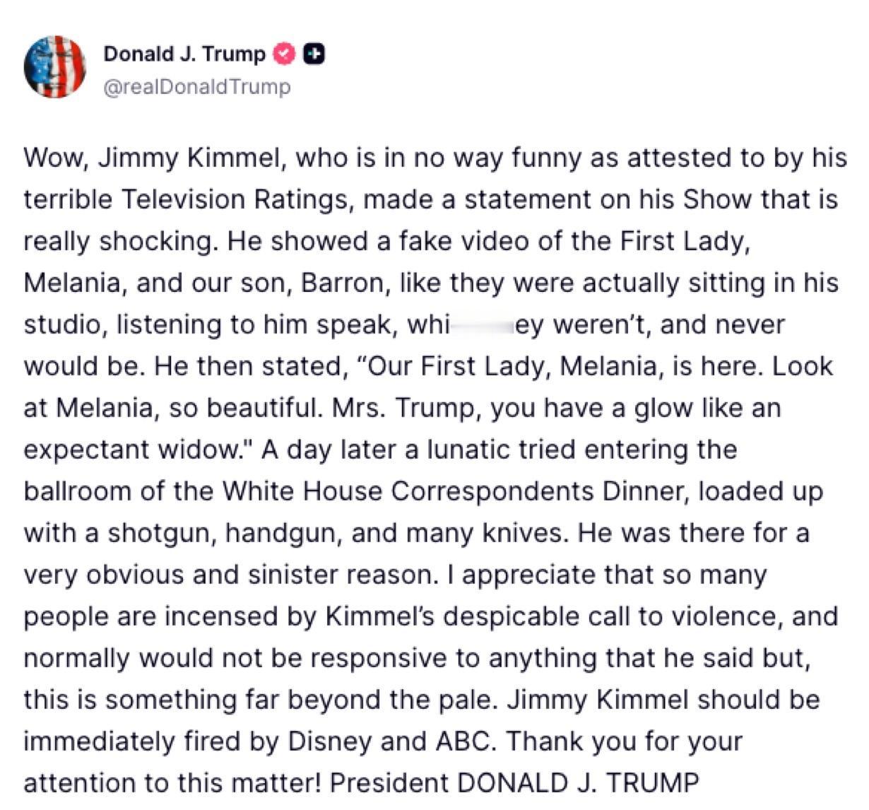 特朗普要求ABC立即解雇吉米·金梅尔,因其“可鄙”的言论称第一夫人梅拉尼娅为“期待中的寡妇”: “我很感激这么多人对金梅尔那可鄙的暴力呼吁感到愤怒,通常我不会对他的任何言论做出回应,但这件事情远远超出了底线。” “迪士尼和ABC应该立即解雇吉米·金梅尔。” 而此前,唐纳德·特朗普在上个月罗伯特·穆勒(主持人)去世后:“我很高兴他死了。他再也不能伤害无辜的人了!”