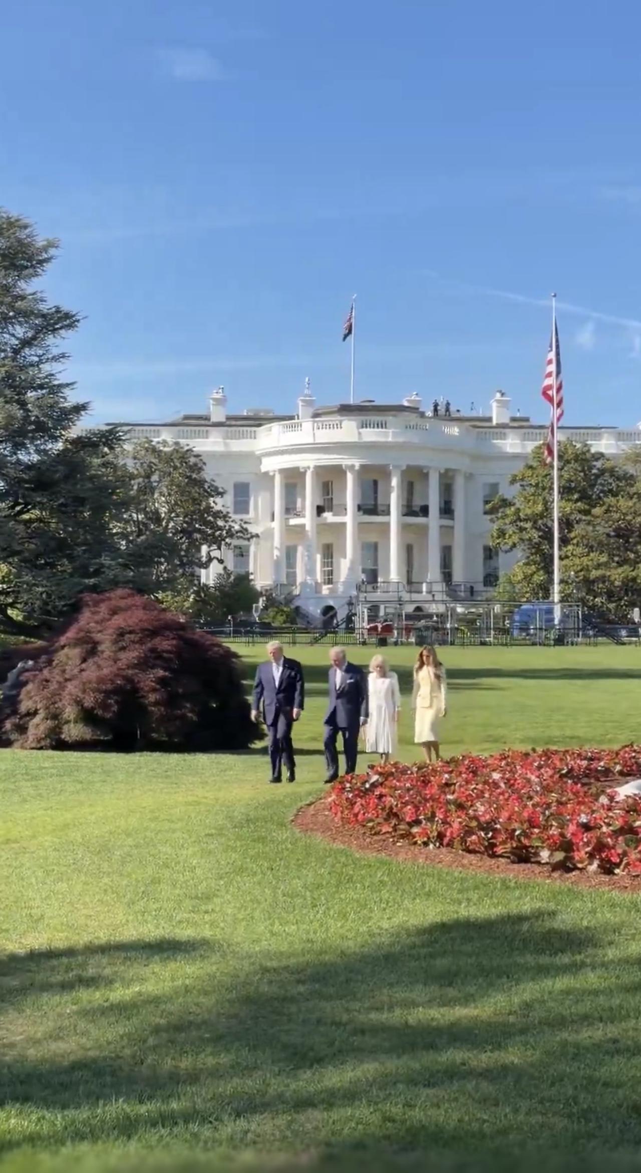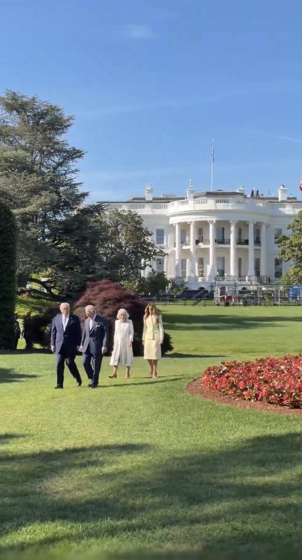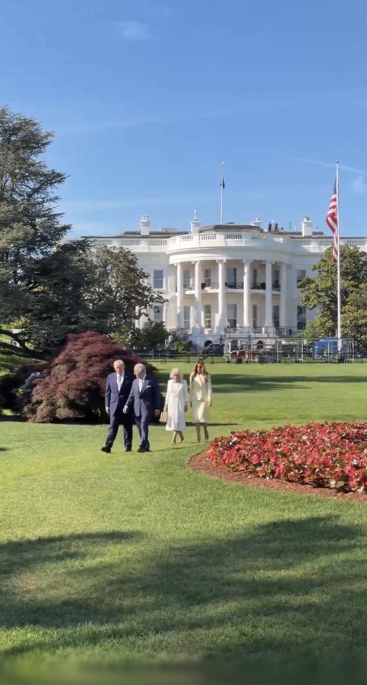 美国总统特朗普和第一夫人梅拉尼娅·特朗普与查尔斯国王和卡米拉王后在白宫南草坪上散步,了参观梅拉尼娅的新蜂箱。