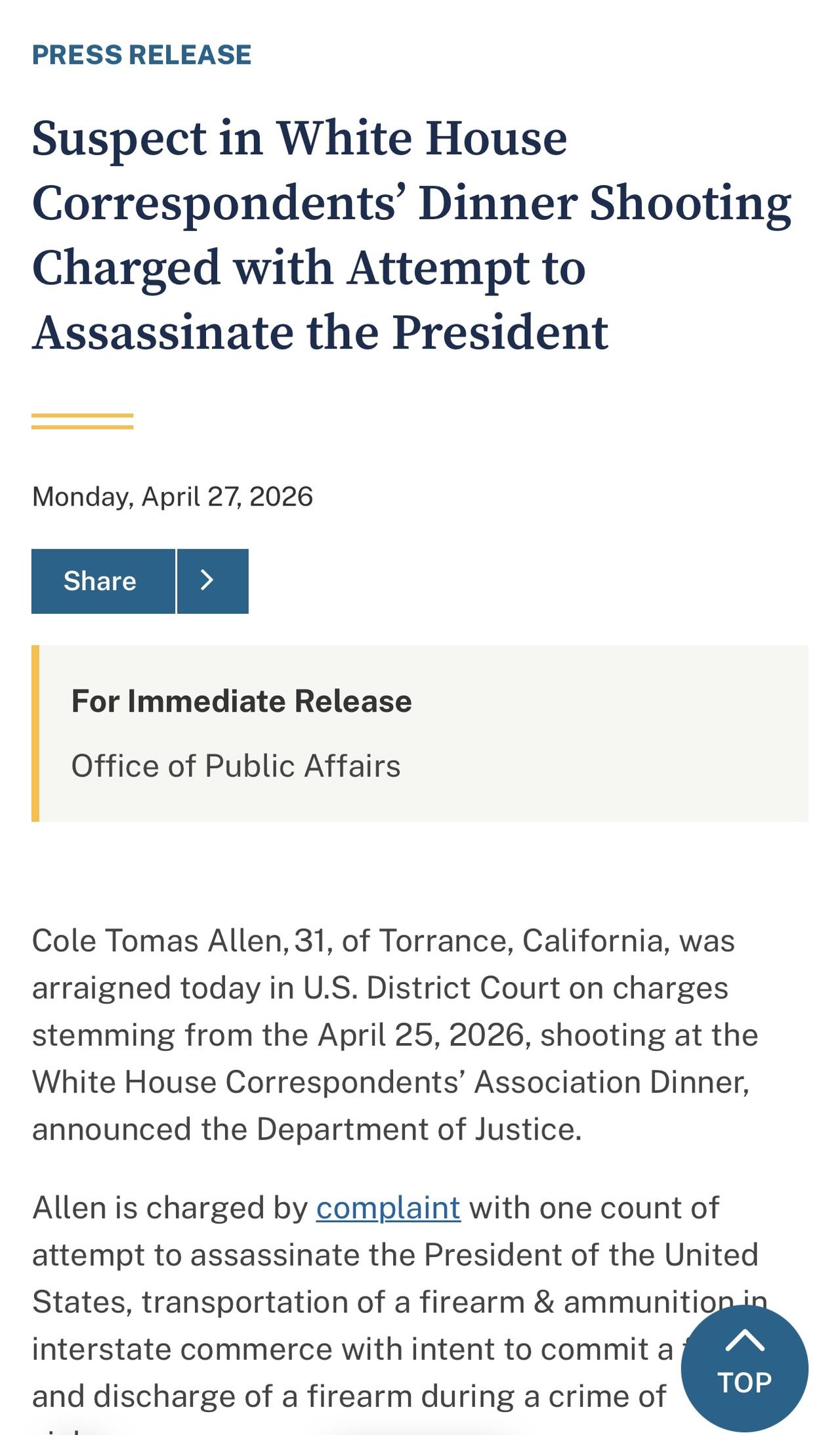 美国司法部起诉指控白宫记者晚宴枪击案嫌疑人科尔.艾伦企图暗杀总统。 “科尔·艾伦现在将面临联邦司法的全部重罪指控。”代理司法部长托德·布兰奇表示。“这位被指控的刺客被阻止,是因为执法人员以勇气和专业精神毫不犹豫地履行职责。因为他们,美国总统、政府官员以及晚宴所有与会者都平安无事。别搞错了:对我们民选官员的疯狂袭击绝不会逍遥法外。”