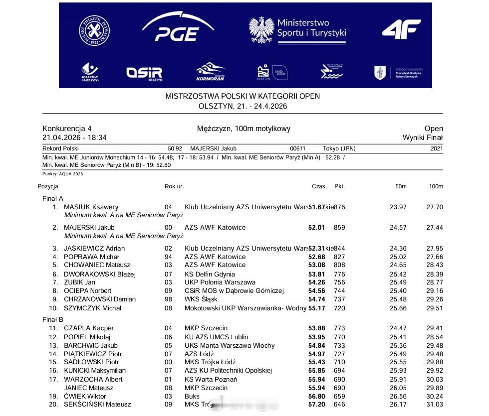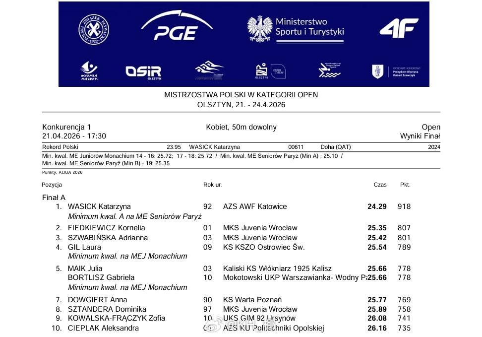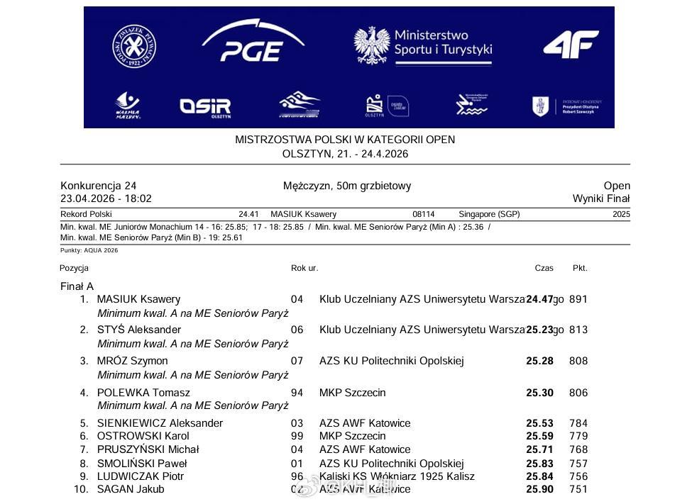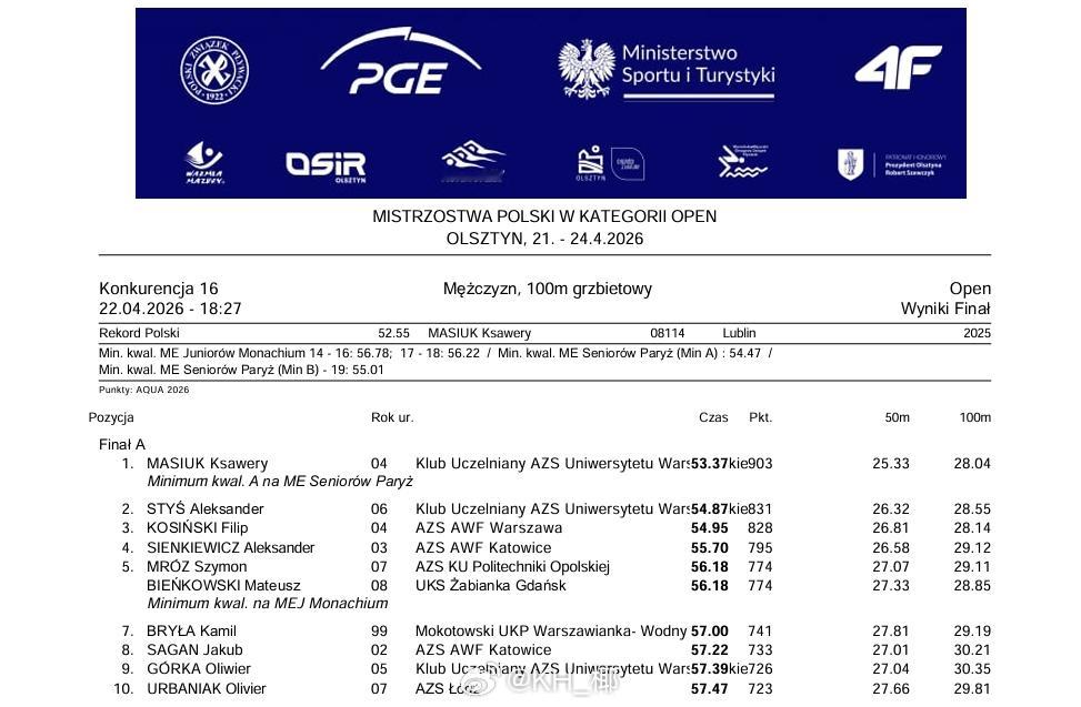 波兰游泳锦标赛 (4.21-24)Ksawery Masiuk50仰:24.47 🥇100仰:53.37 🥇100蝶:51.67 🥇Kasia Wasick 50自:24.29 🥇