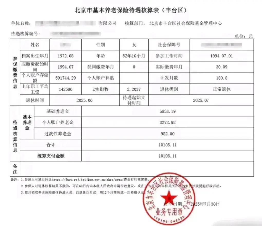 要说哪些地方的养老待遇高,北京的养老待遇必定名列前茅。且看这一份北京市丰台区的退休女职工基本养老保险待遇核算单,月享10108.11元,多少退休人员的养老金天花板! 她1972年8月出生,1994年7月参加工作,2025年6月正常退休,实际缴费年月30.09年,退休年龄52年10个月,养老金计发月数180.8。 看看她核算养老金的各项数据,全都很高: 退休时个人账户累计储存额¥591,744.29,这么高的个人账户储存额真让我大开眼界了! 上年职工平均工资高达¥142,596,平均到12个月¥11,883,北京在岗职工平均工资真高呀!她指数2.2037。 再看她基本养老金的各项组成: 基础养老金¥5853.19,将近¥6000了; 过渡性养老金¥982,这个数额不高; 个人账户养老金¥3272.92,多缴多得。 基本养老金合计为10108.11元。 分析这位北京退休女工的高额养老待遇,之所以这么高,得益于她所在地北京市的养老金计发基数,更得益于她高额的个人账户累计储存额,长缴、多缴,所以多得。 这么高的养老待遇,退休了也能财富自由! 看到她52年10个月的退休年龄,不由想起我之前的两位老同事,她俩都是顶职补员参加工作的,他们的退休年龄跟我们有点不一样,我们女教师干部编制55岁退休,他们好像是职工编制52周岁就可以退休了,她们都申请到了55周岁退休。当然我们的退休养老待遇都不及这位北京退休女工基本养老金的一半。 羡慕不眼红,随遇而安,知足者常乐!