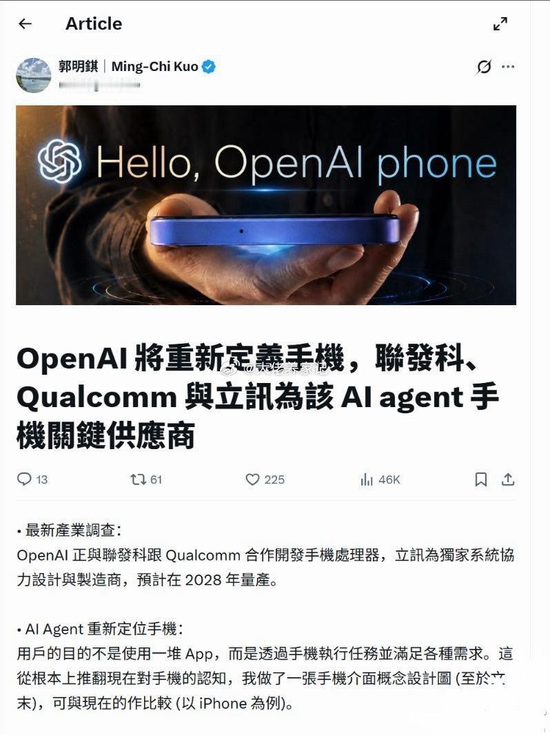 【参与OpenAI手机项目?立讯精密市值一日爆增400亿元!】日前,记者经产业链调研获悉,立讯精密确已参与了OpenAI自研AI Agent手机项目,且是该手机的关键零部件供应商和整机制造商。4月27日,立讯精密盘中最高触及72.6元/股,总市值突破5200亿元,再次创下历史新高。截至当日收盘,立讯精密报71.97元/股,涨9.05%,总市值约为5244亿元,较前一交易日收盘暴增434.97亿元。 消息面上,4月27日,天风国际证券分析师郭明錤在社交平台以《OpenAI将重新定义手机,联发科、Qualcomm与立讯为该AI Agent手机关键供应商》为题,发表最新产业调研报告称:“OpenAI正与联发科跟Qualcomm(高通)合作开发手机处理器,立讯为独家系统协力设计与制造商,预计在2028年量产。”记者经产业链调研获悉,OpenAI已经选择立讯精密作为关键零部件供应商和整机制造商。