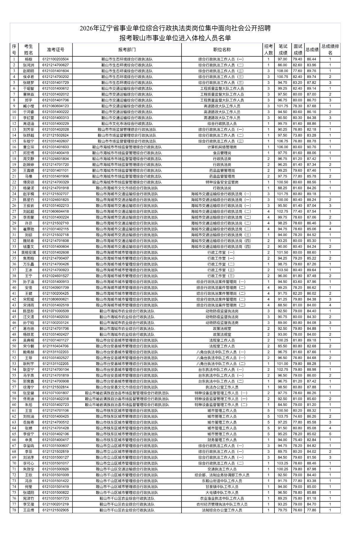 速看!鞍山事业单位体检名单公布! 📌 发布单位:鞍山市人力资源和社会保障局 🔍 通知信息:2026年辽宁省事业单位综合行政执法类岗位招聘体检名单已公布,共78人进入体检环节 ⏰ 重要日期:体检时间为2026年5月7日6:30集合,5月6日17:00前可申请放弃 💡 后续提醒:体检需携带身份证、照片及现金498元体检费,请提前做好准备 事业单位 辽宁事业单位 鞍山事业单位 考编 体检通知 公考 备考