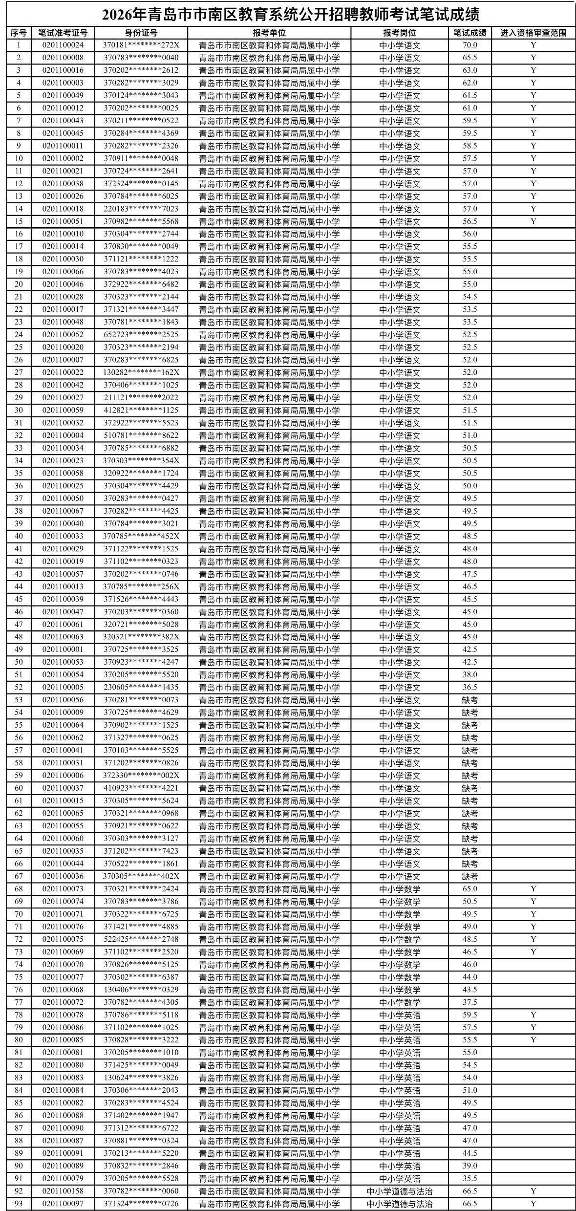 速查!青岛南区教师招聘笔试成绩公布! 📌 发布单位: 青岛市市南区教育和体育局 📌 通知信息: 2026年教师招聘笔试成绩已公布,最低合格分数线为40分。进入资格审查人员名单见附件(标注'Y')。 📌 重要日期: 资格审查及面试时间将另行通知,请及时关注。 📌 后续提醒: 进入资格审查的同学请提前准备相关材料,未进入的也不要气馁,继续关注其他机会。 教师招聘 青岛教师 事业单位 考编 教师考试 青岛事业单位 备考