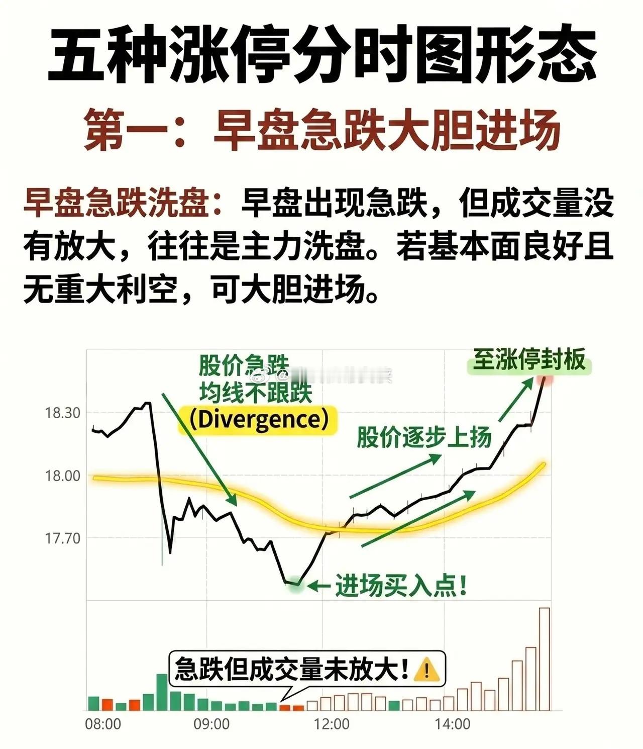 * 形态特征:早盘开盘后出现快速下跌,但成交量并未明显放大。分时图上呈现出“股价急跌,均线不跟跌”的背离(Divergence)现象。* 主力意图:这通常是主力资金的洗盘行为,通过快速下杀制造恐慌,清洗浮筹。由于下跌缩量,说明主力并没有大规模出逃。* 操作策略:如果个股基本面良好且无重大利空消息配合,这种急跌往往是绝佳的低吸机会。图中标注的“进场买入点”之后,股价通常会企稳并逐步上扬,最终甚至冲击涨停封板。