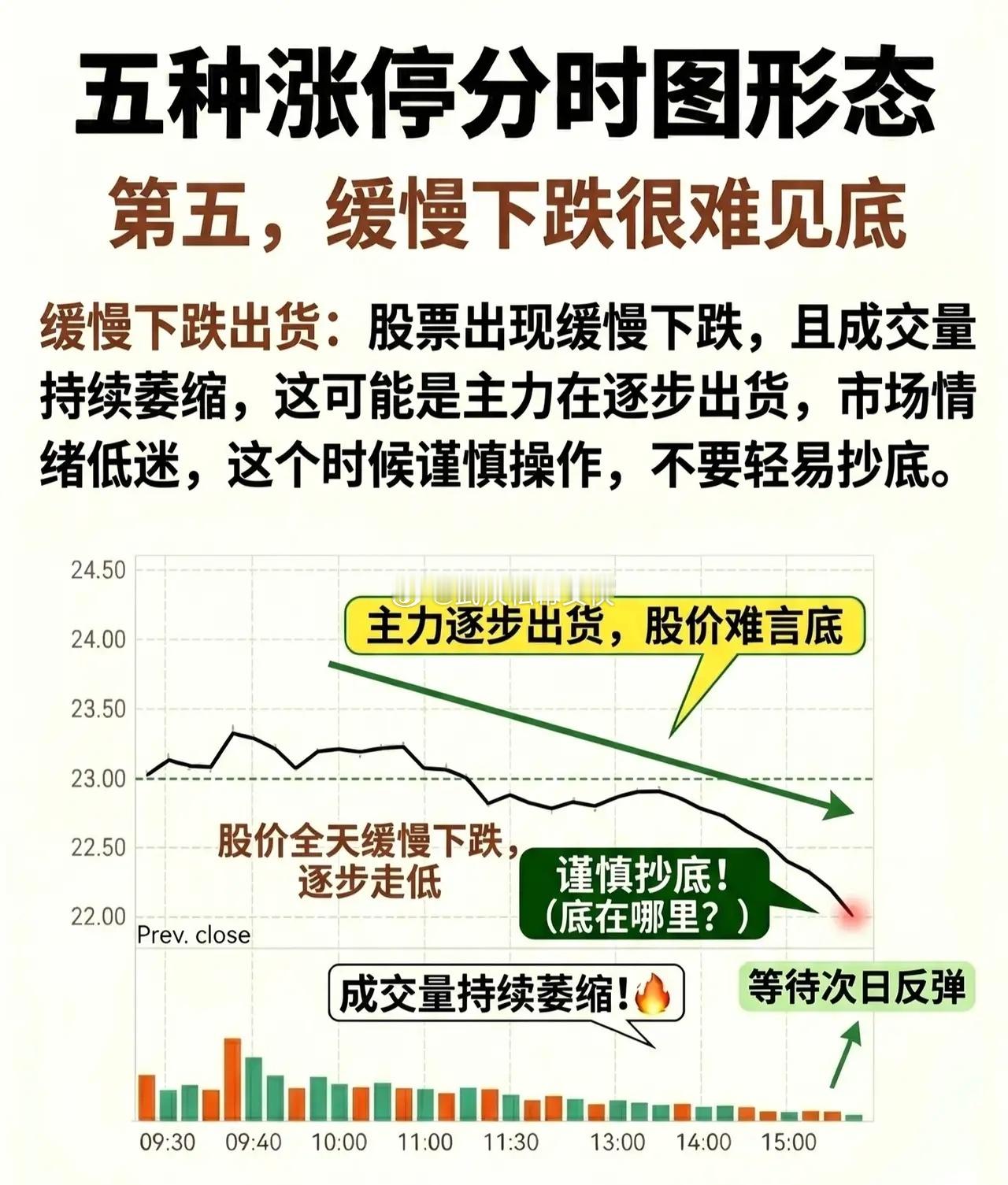 * 形态特征:股票全天呈现缓慢震荡走低的态势,且成交量持续萎缩。* 主力意图:这往往是主力在逐步出货的表现,市场情绪极度低迷,缺乏承接盘。* 操作策略:这种形态下股价“难言底”,投资者应谨慎操作,不要轻易抄底。盲目补仓很容易陷入“阴跌”的深渊。
