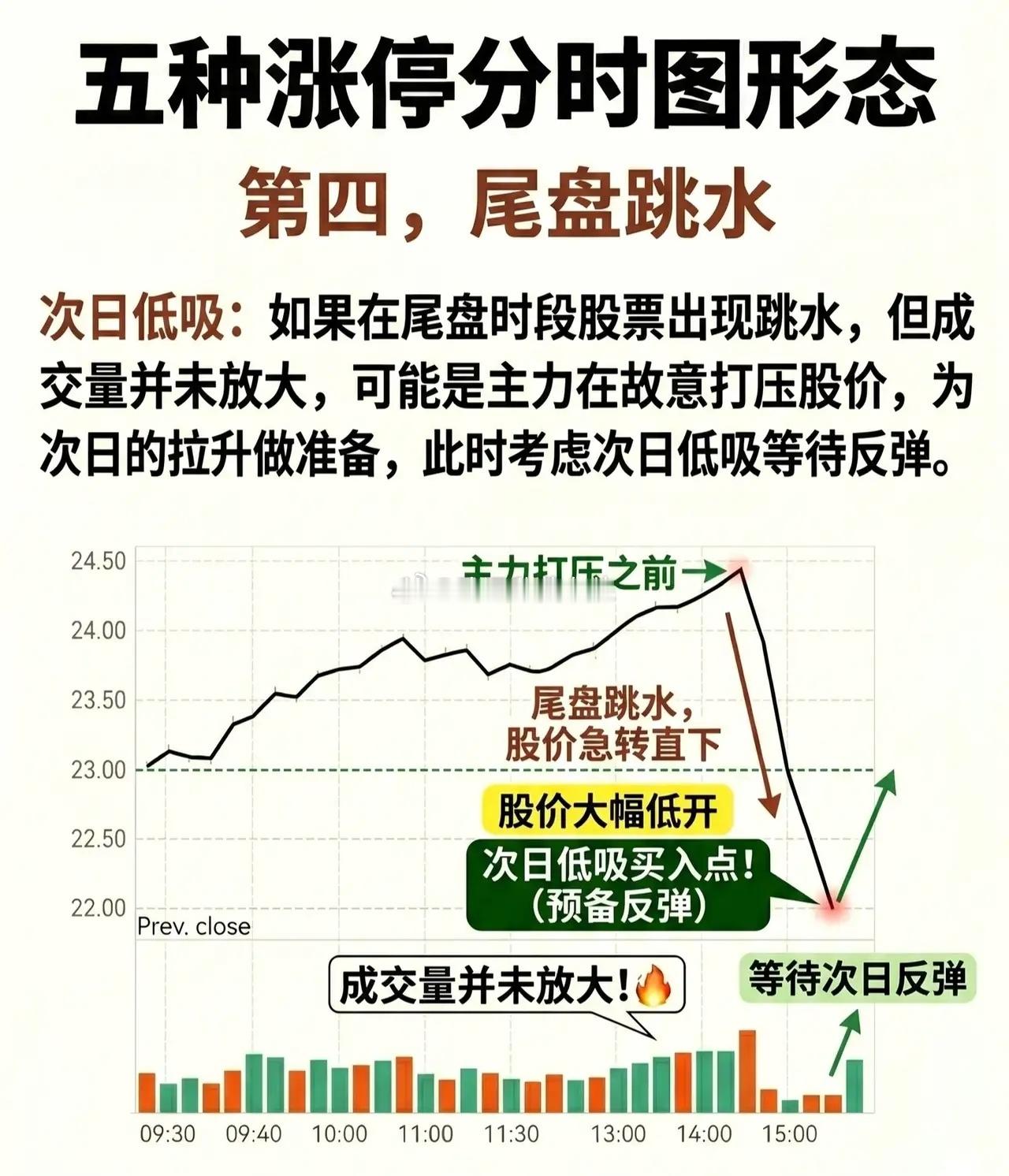 * 形态特征:临近收盘或收盘时段,股价突然出现快速下跌(跳水),但成交量并未显著放大。* 主力意图:这可能是主力在故意打压股价,制造恐慌氛围,目的是清洗不坚定的筹码,为次日的拉升做准备。* 操作策略:当日不宜恐慌卖出,反而可以考虑次日低吸等待反弹。图中标注的“次日低吸买入点”即是预期的反转位置。