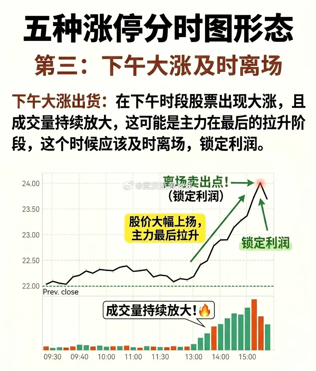 * 形态特征:在下午交易时段,股价突然出现大幅上扬,且成交量持续放大。* 主力意图:这通常被视为主力在进行最后的拉升阶段(诱多),目的是为了在收盘前将股价维持在高位,方便次日继续出货。* 操作策略:此时不是追涨的时候,而应考虑及时离场,锁定利润。图中提示的“离场卖出点”就是获利了结的最佳时机。