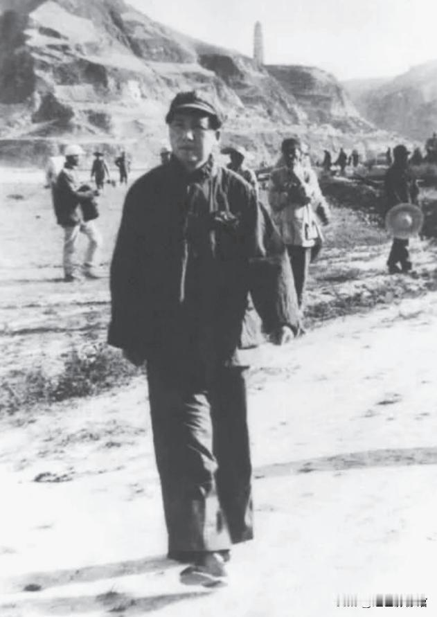毛泽东在宝塔山下的延河河畔步行