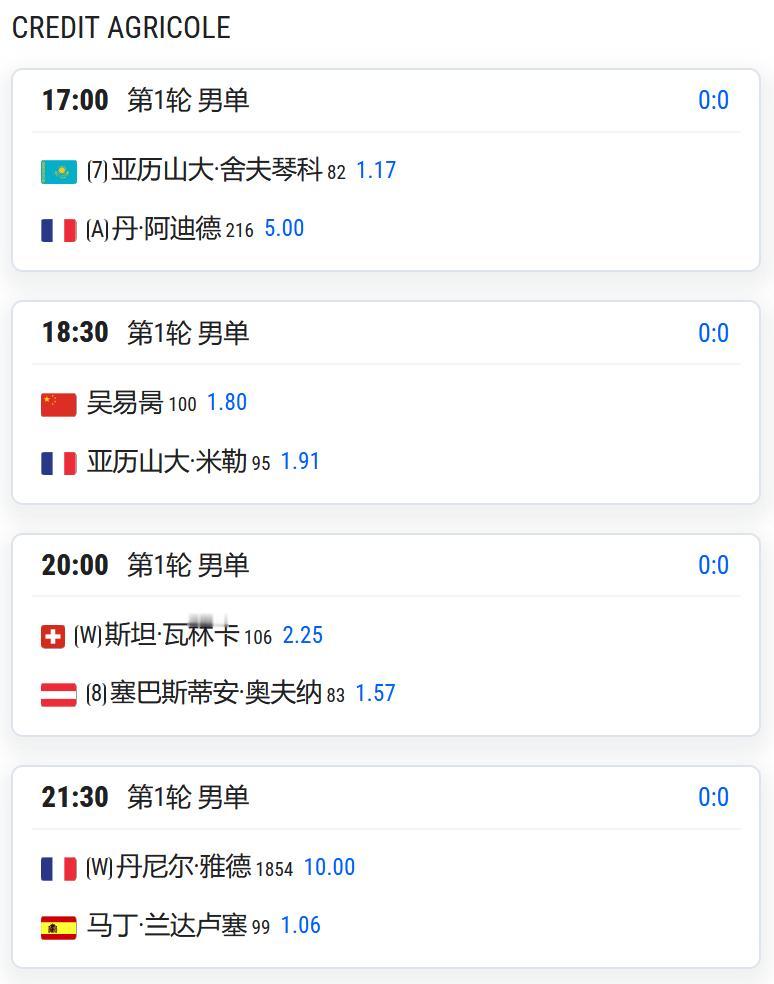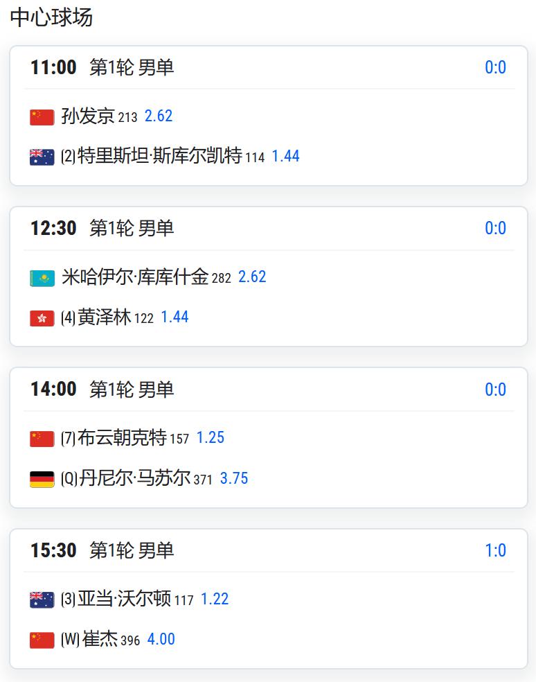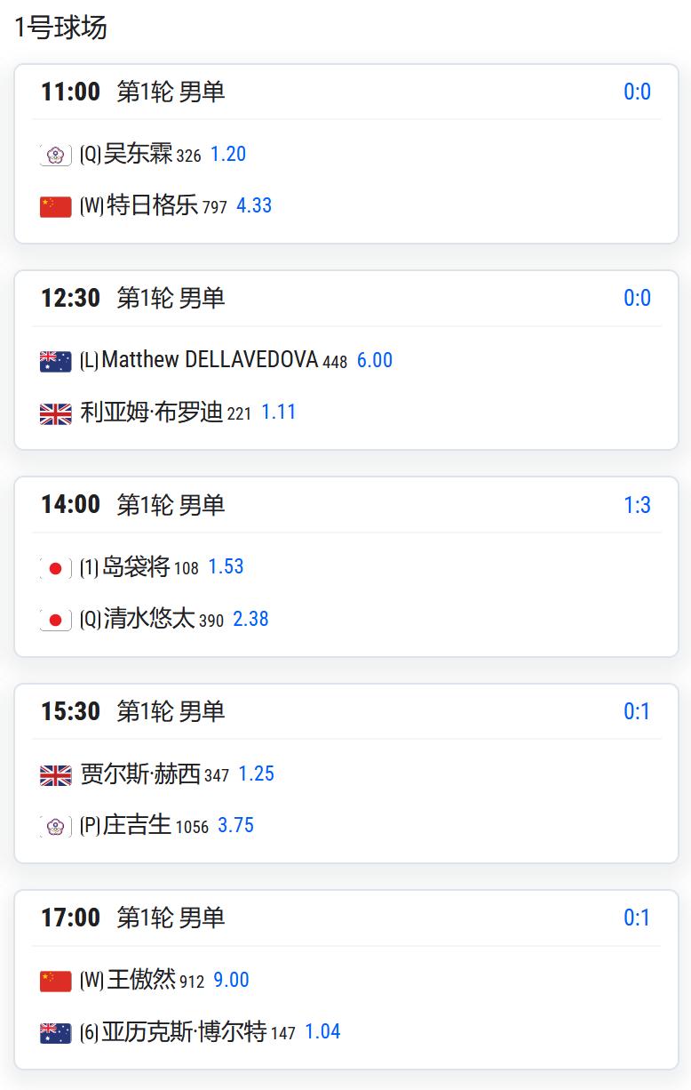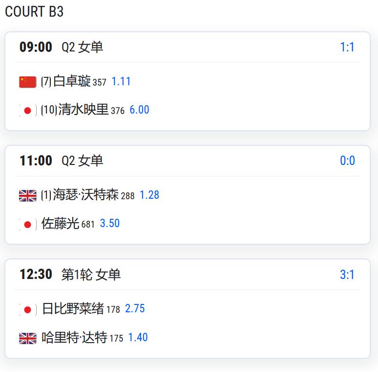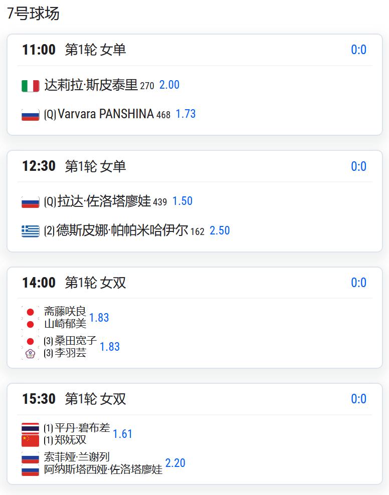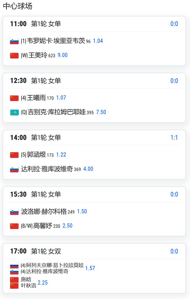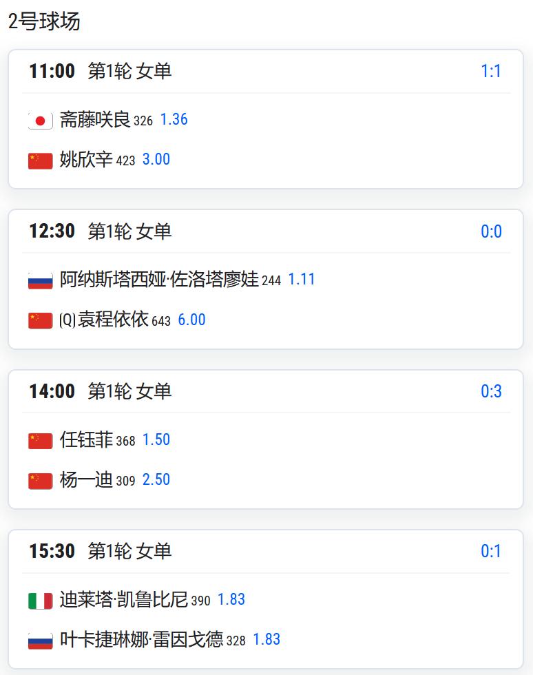 CH175普罗旺斯,男单第一轮,吴易昺将对阵法国人米勒; WTA125湖州,女单第一轮: 持外卡参赛的王美玲将对阵头号种子埃里亚维茨; 王曦雨将对阵从资格赛突围的库拉姆巴耶娃; 郭涵煜将对阵雅库博维奇; 高馨妤将对阵赫尔科格; 姚欣辛将对阵日本的斋藤咲良; 从资格赛突围的袁程依依将对阵佐洛塔廖娃; 任钰菲将与杨一迪隔网相对; 女双第一轮,施晗/叶秋语将对阵4号种子易卜拉欣莫娃/雅库博维奇; 郑妩双/碧布差将对阵俄罗斯组合兰谢列/佐洛塔廖娃。 WTA125拉维斯瓦尔-登波尔达,王欣瑜以头号种子出战,首轮对阵西班牙球员克韦多; W100岐阜,女单资格赛决胜轮,白卓璇将与清水映里争夺一个正赛席位; 李宗钰将与清水绫乃争夺一个正赛席位; CH75九江,男单第一轮: 孙发京将对阵2号种子斯库尔凯特; 7号种子布云朝克特将对阵资格赛球员马苏尔; 持外卡参赛的崔杰将对阵3号种子沃尔顿; 持外卡参赛的特日格乐将对阵从资格赛突围的中国台湾球员吴东霖; 持外卡参赛的王傲然将对阵6号种子博尔特。