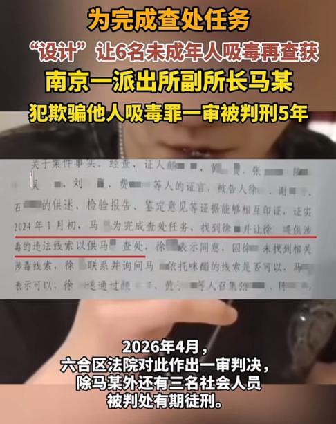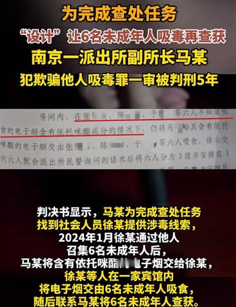 “太荒唐了!”江苏南京,一派出所副所长竟然为了完成“业绩”,“设计”让6名未成人吸毒,而后再趁机查获6名未成年人。结果悲剧了,被以欺骗他人吸毒罪,判处有期徒刑5年! 在老百姓的心里,派出所民警就是身边最靠谱的安全感。 心智不成熟、社会阅历浅的未成年人来说,执法人员更是守护他们安稳成长的重要防线。 可南京曝出的一桩案子,看完着实让人瞠目结舌,颠覆了大众的固有认知。 一名深耕基层多年的派出所副所长,手握执法实权,本该兢兢业业禁毒护民、守护青少年健康成长,却被工作业绩裹挟,动了歪心思。 这场离谱又讽刺的闹剧,最终不仅毁掉了六个孩子的青春,也让他自己丢掉铁饭碗,落得五年牢狱的下场。 派出所的日常工作琐碎又繁杂,禁毒排查是每年硬性落地的重点任务,也是基层民警逃不开的考核项目。 涉事副所长马某所在的南京辖区,整体治安算得上相当不错。 眼看着考核截止日期越来越近,自己全年的工作成果达不到标准,评优晋升彻底落空,巨大的压力让他彻底丢掉了从业初心。 考核指标存在的意义,不是逼迫民警凑数据,而是督促大家不要躺平,在平稳的治安环境里,主动深挖那些藏在暗处的违法隐患。 指标完不成,最正确的做法是调整工作方式、扩大排查范围,多关注青少年私下聚会、私人民宿、隐蔽出租屋这类容易被忽略的场景。 可马某完全不想耗费精力踏实干活,满脑子只想着走捷径、凑业绩。 为了让这场造假戏码看起来毫无漏洞、完美骗过审核人员,他急需一个合适的中间人帮忙落地所有前期操作。 经过一番筛选,常年混迹本地商圈、交友杂乱的社会人员徐某进入了他的视线。 徐某平时最爱混迹各类休闲场所,认识一大批在校学生和闲散青少年,非常懂当下年轻人的社交方式和玩乐喜好,邀约人员、组织聚会对他来说轻而易举,是最合适的合作人选。 两人很快达成默契,敲定了利益交易,一套分工明确的造案计划就此成型。 徐某借着免费体验新款网红电子烟的借口,轻轻松松就把六名孩子邀约到了私密性极强的宾馆房间。 在密闭的环境里,年纪尚小的孩子们根本没有辨别风险的能力,也抵挡不住猎奇心理。 在单一的考核标准下,这次抓捕让马某顺利完成年度任务,得以安稳过关、参与评优。 可剥开光鲜的表面,内里满是荒唐与讽刺。 这起案子的六个当事人,都是干净单纯的青少年,没有任何不良记录。 案件线索来源模糊,整体模式刻意又生硬,疑点数不胜数,瞬间引起了审核人员的高度警惕。 工作人员顺着层层溯源、深入核查,这场精心包装的造案骗局彻底败露。 马某也随即被立案调查、依法追责。 公权力承载的是老百姓的信任,是守护万家平安的底气,绝对不是个人谋取利益、刷取业绩的工具。 手握执法权的人一旦丢失敬畏心、失守职业底线,造成的社会危害远比普通犯罪更严重。 只有守住职业初心、恪守法律底线,敬畏手中的公权力,才能真正做到为民执法,杜绝这类本末倒置、害人害己的荒唐闹剧再次上演。 对于这件事,您有什么想说的吗?欢迎评论区留言讨论。 信息来源:新京报