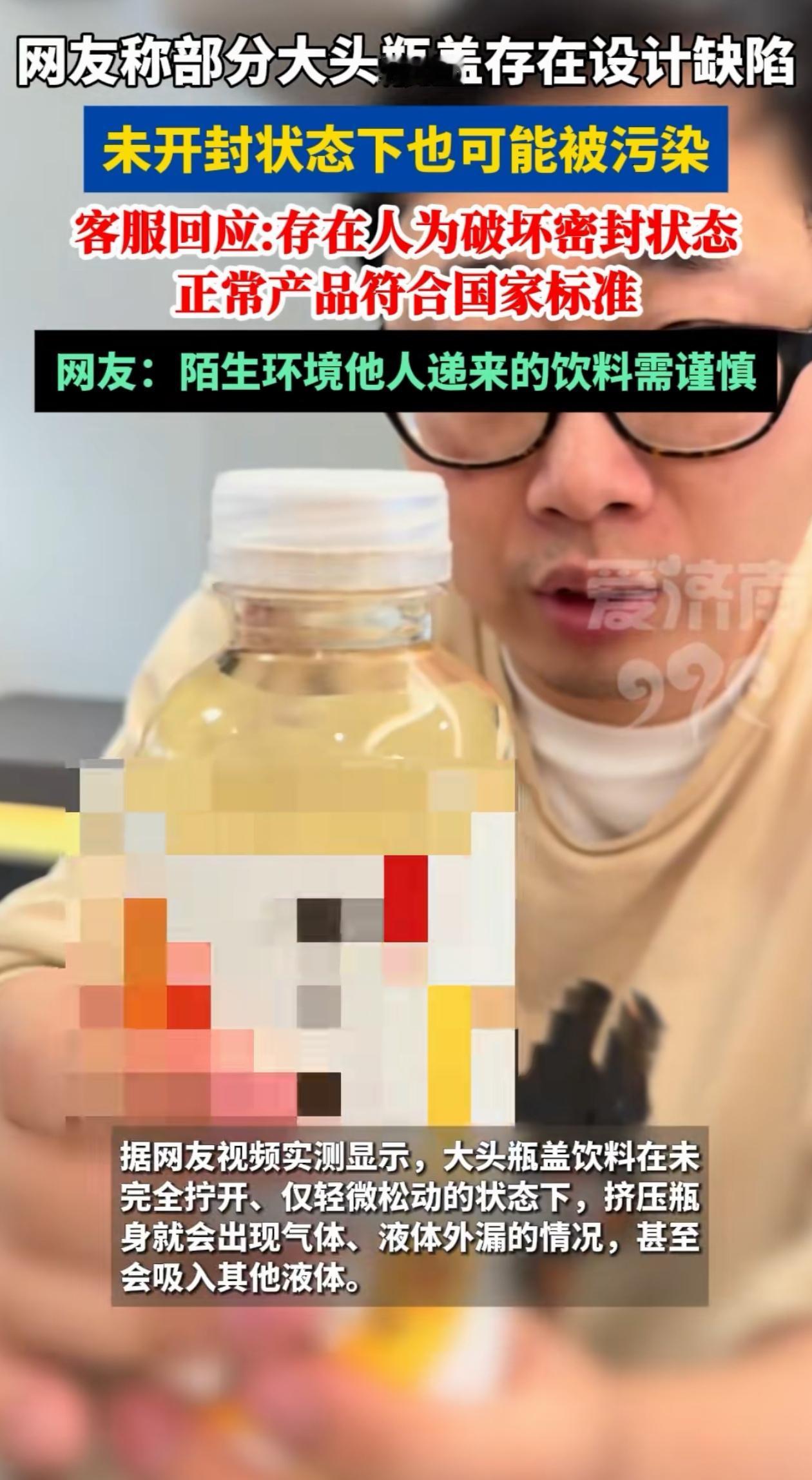 出乎意料了!男子发现市面上那种“大头瓶盖”的饮料,可能存在设计上的小毛病。他演示了一下,发现哪怕瓶子没开封,只是瓶盖稍微有点松动,这个时候用手一捏瓶身,里头的液体就可能渗出来,甚至外面的脏东西也有可能被吸进去。 这可不是小事,万一在运输、储存过程中沾上点不干净的东西,消费者拧开就喝,健康风险可就大了。 面对质疑,相关企业的客服出来回应了,话术挺经典:说这是“人为破坏密封状态”导致的,正常出厂的产品那都是符合国家标准的,绝对安全。 这回应一出,网上更热闹了。有网友觉得功能性设计和绝对密封,有时候就像鱼和熊掌。 企业解释大头瓶盖采用“先泄压再断环”设计,主要是为了防止碳酸饮料内部压力太大,“嘭”一下把盖子顶飞。 这个设计逻辑本身有它的道理,相当于给瓶内压力装了个安全阀。 但问题就在于,在瓶盖没拧到位或者轻微松动时,它就成了液体和外界交换的薄弱点,很容易给外面的东西“可乘之机”。 当然,客服说“符合国标”可能也没有错,因为现行的国家标准,主要关注的是瓶盖的物理强度、卫生指标这些出厂状态。 对于“瓶盖轻微松动到啥程度会漏液”、“螺纹部分如何防止外部污染侵入”这些具体又细微的使用场景,标准里可能没有,或者缺乏明确的量化规定,所以才会导致顾客和客服都觉得自己有理。 但说到底,真正的“安全”和“合格”,不应该只是流水线终点的一份检测报告,更应该贯穿于产品被拿起、被触碰、被使用的每一个细微瞬间。 毕竟,喝到嘴里的东西,容不得半点“大概也许可能没问题”!