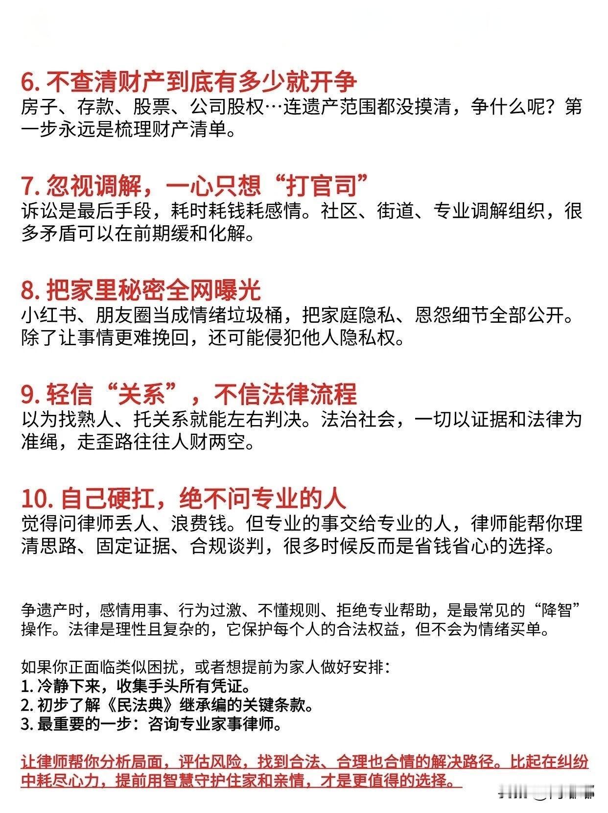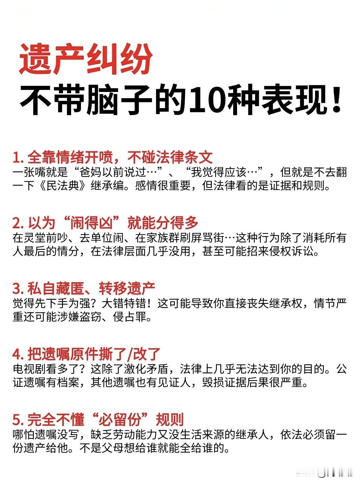 遗产纠纷,不带脑子的10种表现。[祈祷]很多家庭,老人在世时一片和睦。可等老人百年之后,家里的子女为了老人留下的那点东西撕破脸的事,并不少见。 有些人平时看着挺机灵的,可一到这事上就犯糊涂。 有的人一听老人去世了,赶紧去老房子把值钱的东西搬走,甚至把门锁都换了。觉得谁先拿到手就是谁的,这不瞎胡闹吗? 法律上讲的是继承权,不是你手快就能都占下。你这么一搞,其他继承人直接告你侵占遗产,官司还没打就先输一截。 其实遗产纠纷很多都是可以避免的,关键就是别犯这些低级错误。 该立遗嘱的时候别拖,该找专业的人一定要找,白纸黑字写清楚。 财产传承是件严肃的事,不是为了给后人添堵的,你说是不是? 希望能帮到大家。 对此,评论区各位朋友怎么看?遗产处置新规 遗产房屋纠纷 遗产避坑 子女遗产纠纷