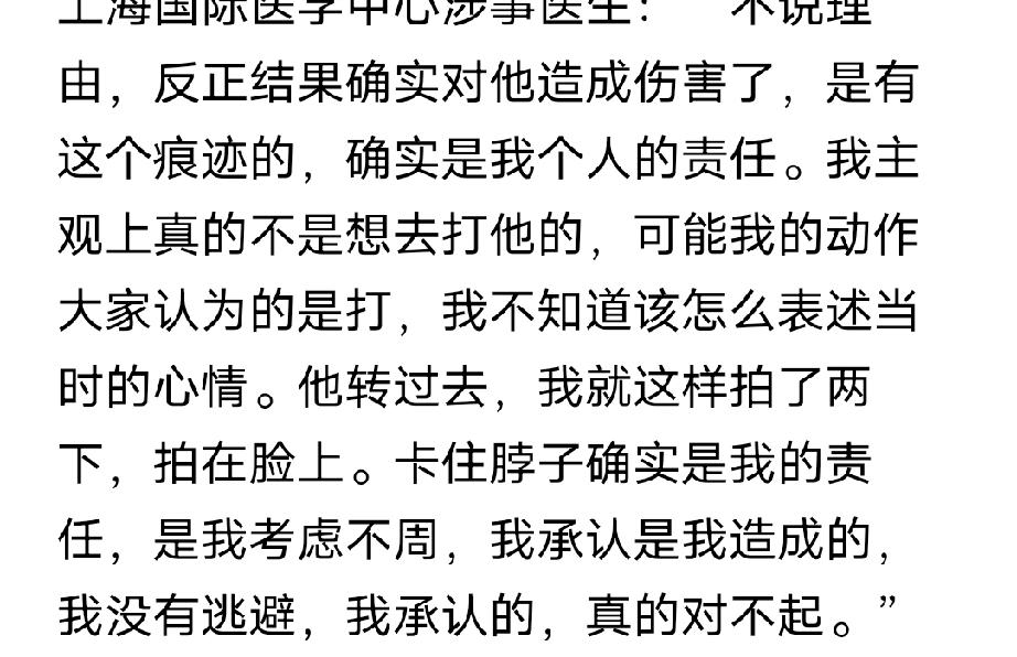上海,女子带7岁的儿子到某医学中心做鼻腔镜检查,不料,孩子因害怕拒绝配合,医生瞬间火冒三丈直接对孩子动粗,导致孩子颈部软组织损伤和皮肿。后经民警调解,医生当面道歉,但院方先是同意赔偿又出尔反尔,至今双方仍未就赔偿达成一致,事件曝光,网友炸锅了。 范女士家住上海浦东周浦,她7岁多的儿子患有鼻炎,症状加重后在公办医院治疗效果不佳。 今年3月份,范女士于是带着孩子去了某医学中心做进一步检查。 儿童鼻腔镜的管子又长又粗,大人看了都容易害怕,更何况一个7岁的孩子。 检查时,小男孩和医生反复拉扯抗拒,没想到医生当着范女士的面,直接()了孩子的脖子,还疑似扇了他2巴掌。 孩子当场被吓住,脖子立刻就红了,留下了明显的掐痕,之后才配合完成了检查。 回家后,范女士和丈夫看到孩子脖子上红肿的伤痕,又心疼又生气,决定找院方讨说法,随后报警维权。 民警给孩子开具了验伤单,报告显示颈部软组织损伤和皮肿。 之后在民警的调解下,涉事医生当面向范女士一家道了歉,承认是自己的责任,说:“确实是我个人的责任,结果也确实对他造成伤害了,卡住脖子是我考虑不周,拍脸也不是故意想打他。” 收到道歉后,范女士一家签署了对医生的谅解书,但仍要求院方承担民事赔偿责任。 一开始院方只同意免除一次诊疗费,范女士一家不同意,后来院方又提出赔偿2000元,还是没谈拢。 范女士拨打12345热线后,卫健委介入,双方一度谈好赔偿5000元,可没想到院方突然出尔反尔,要求范女士签免责责任书,还说5000元赔偿也没了,让他们走司法途径解决。 记者联系院方和卫健委,都没有得到明确回复,事情至今悬而未决。 这个事件曝光后,引发网友热议,不少网友都觉得,孩子不配合检查,医生完全可以找家长帮忙安抚,或者暂停检查,根本不是动手的理由。 也有人说,就算医生是为了让孩子配合,掐脖子扇脸也超出了合理范围,更何况还造成了软组织损伤。 更让人气愤的是,院方出尔反尔的态度,一开始同意赔偿,后来又反悔,让家长维权变得难上加难。 到目前为止,涉事医生和医院都没有公开的处罚结果,卫健委也还没给出明确的处理意见。 《民法典》第1218条规定,患者在诊疗活动中受到损害,医疗机构或者其医务人员有过错的,由医疗机构承担赔偿责任。 范女士的孩子是在医院做鼻腔镜检查时被医生掐脖子、扇巴掌导致受伤,属于诊疗过程中受到的人身损害。 涉事医生存在明显过错,按照这条法律规定,医院应该代替医生承担相应的赔偿责任,不能随便反悔之前谈好的赔偿方案。 《治安管理处罚法》第43条,殴打他人的,或者故意伤害他人身体的,处5日以上10日以下拘留,并处200元以上500元以下罚款,情节较轻的处5日以下拘留或者500元以下罚款,殴打不满14周岁的人要从重处罚。 范女士的孩子只有7岁,属于未成年人,医生动手掐脖子、扇巴掌已经构成故意伤害他人身体。 即便孩子只是软组织损伤没构成轻伤,也符合这条处罚规定,警方完全可以依法对这名医生作出治安处罚,而不是只简单道歉就了事。 对于这件事,大家怎么看?