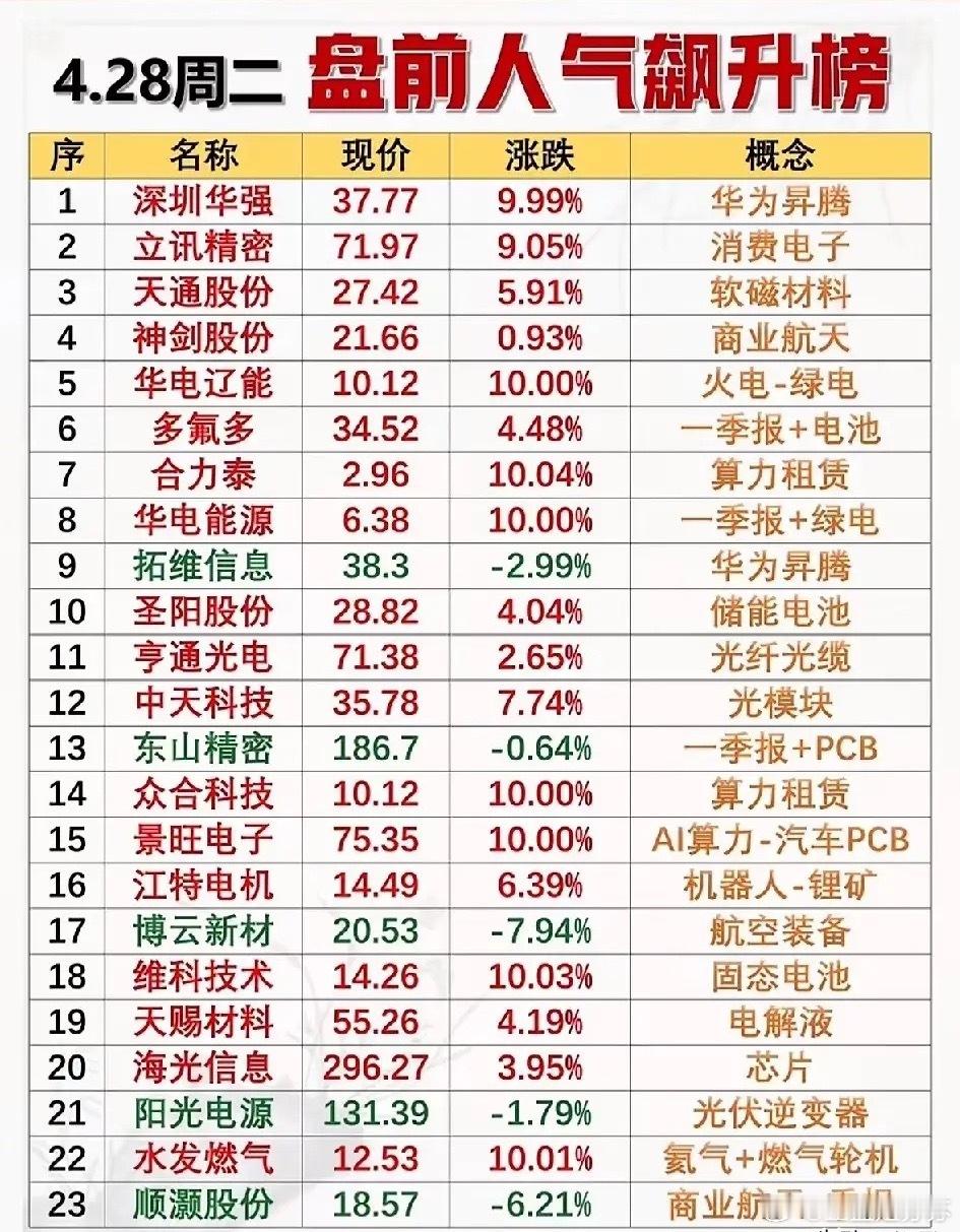 4.28盘前人气飙升榜全景解析:主线轮动下的市场焦点全梳理!今日盘前人气飙升榜覆盖AI算力、绿电、消费电子、商业航天、固态电池等多大赛道,呈现多线开花的市场格局。其中AI算力与绿电板块涨停个股扎堆,一季报催化、软磁材料、电解液等方向也获资金关注,同时部分前期涨幅较大的标的出现短期调整,体现出市场主线轮动与分化的节奏。个股梳理分析1. 深圳华强:华为昇腾核心概念股,当日涨停,受益于AI算力产业链景气度提升,作为板块人气龙头,市场关注度持续走高。2. 立讯精密:消费电子龙头,当日大涨,受益于消费电子复苏预期,同时切入AI硬件供应链,订单与业绩弹性具备想象空间。3. 天通股份:软磁材料核心标的,当日大涨,产品广泛应用于AI、新能源领域,软磁材料需求随行业扩张持续提升。4. 神剑股份:商业航天概念股,当日小幅上涨,业务覆盖航天配套材料,受益于商业航天新业态发展,具备长期成长潜力。5. 华电辽能:火电+绿电标的,当日涨停,受益于电力供需紧张及绿电转型政策,火电盈利修复叠加新能源布局推动业绩改善。6. 多氟多:一季报+电池概念股,当日上涨,电解液龙头企业,业绩受新能源汽车与储能需求支撑,一季报表现具备看点。7. 合力泰:算力租赁概念股,当日涨停,布局算力相关业务,受益于AI算力需求扩张,低估值叠加题材催化带动股价走强。8. 华电能源:一季报+绿电标的,当日涨停,电力企业绿电转型加速,一季报业绩修复预期叠加电力供需改善,推动股价上涨。9. 拓维信息:华为昇腾概念股,当日小幅下跌,此前板块涨幅较大出现短期调整,核心业务仍围绕AI算力与华为产业链布局。10. 圣阳股份:储能电池概念股,当日上涨,聚焦储能与动力电池业务,受益于储能行业高景气,订单与产能释放支撑业绩增长。11. 亨通光电:光纤光缆标的,当日小幅上涨,光通信龙头企业,受益于算力基础设施建设,光纤光缆与海缆业务需求稳步增长。12. 中天科技:光模块概念股,当日大涨,光通信全产业链龙头,光模块与海缆业务受益于AI算力与海外需求,业绩弹性充足。13. 东山精密:一季报+PCB标的,当日小幅下跌,PCB龙头企业,受益于AI服务器与消费电子需求,当前处于短期调整阶段。14. 众合科技:算力租赁概念股,当日涨停,布局算力相关业务,叠加轨道交通智能化业务,低估值与题材催化推动股价涨停。15. 景旺电子:AI算力-汽车PCB标的,当日涨停,高端PCB产品覆盖AI服务器与汽车电子,受益于算力与汽车智能化需求增长。16. 江特电机:机器人-锂矿概念股,当日上涨,布局锂矿与电机业务,受益于机器人产业发展与锂价企稳,业绩修复预期较强。17. 博云新材:航空装备概念股,当日下跌,业务覆盖航空航天材料,此前涨幅较大出现回调,行业长期发展逻辑仍在。18. 维科技术:固态电池概念股,当日涨停,聚焦固态电池研发与产业化,受益于固态电池技术突破与行业催化,市场关注度高。19. 天赐材料:电解液龙头,当日上涨,电解液业务受益于新能源汽车与储能需求,产能优化与成本控制支撑业绩表现。20. 海光信息:芯片概念股,当日上涨,国产CPU龙头企业,受益于国产替代与AI算力需求,芯片产品适配多类算力场景。21. 阳光电源:光伏逆变器标的,当日小幅下跌,光伏逆变器龙头,受益于全球光伏装机增长,短期随板块波动出现调整。22. 水发燃气:氦气+燃气轮机概念股,当日涨停,氦气业务受益于芯片产业链需求,叠加燃气轮机业务,题材催化带动股价上涨。23. 顺灏股份:商业航天-季报概念股,当日下跌,布局商业航天相关业务,叠加季报催化,此前上涨后出现短期回调。总结整体来看,今日盘前人气榜体现了市场主线轮动与分化的特征,AI算力、绿电两大方向涨停个股集中,是当前市场的核心主线;一季报催化、商业航天、固态电池等方向也获得资金关注,部分前期涨幅较大的标的出现短期调整,市场整体呈现多线轮动的格局。