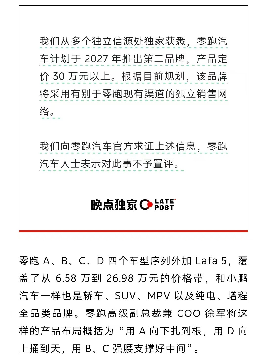 零跑汽车计划于 2027 年推出第二品牌,产品定价 30 万元以上。根据目前规划,该品牌将采用有别于零跑现有渠道的独立销售网络。