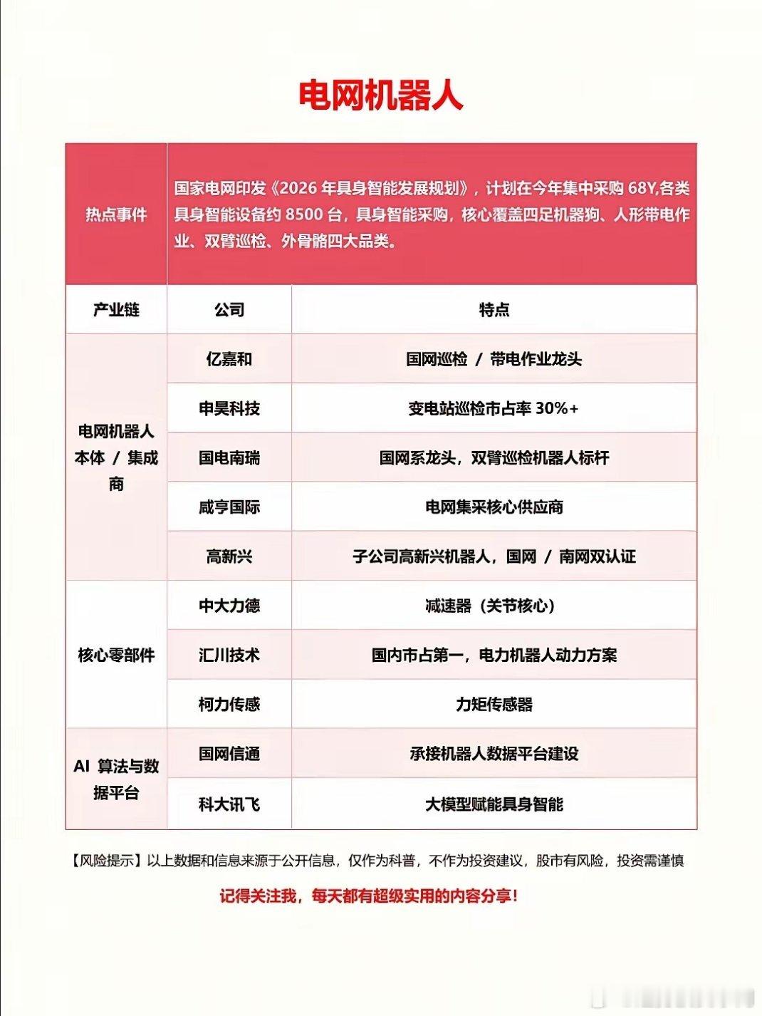 电网机器人赛道强势爆发!国网发布智能发展规划,落地68亿元集采大单,批量采购数千台具身智能设备,覆盖多品类电力作业机器人,行业迎来高速扩容。一、核心产业链标的整机集成(直接受益集采)亿嘉和、申昊科技、国电南瑞、咸亨国际、高新兴,深耕电网巡检与带电作业,卡位核心订单。核心零部件中大力德、汇川技术、柯力传感,覆盖减速器、动力系统、高精度传感器,筑牢硬件核心壁垒。AI算法&平台国网信通、科大讯飞,依托大模型与数据平台,赋能电网机器人智能化升级。电力高危场景机器换人已成趋势,叠加政策加持+大额订单落地,赛道确定性十足,龙头成长空间可观。个人观点,不构成任何投资建议,股市有风险,投资需谨慎。