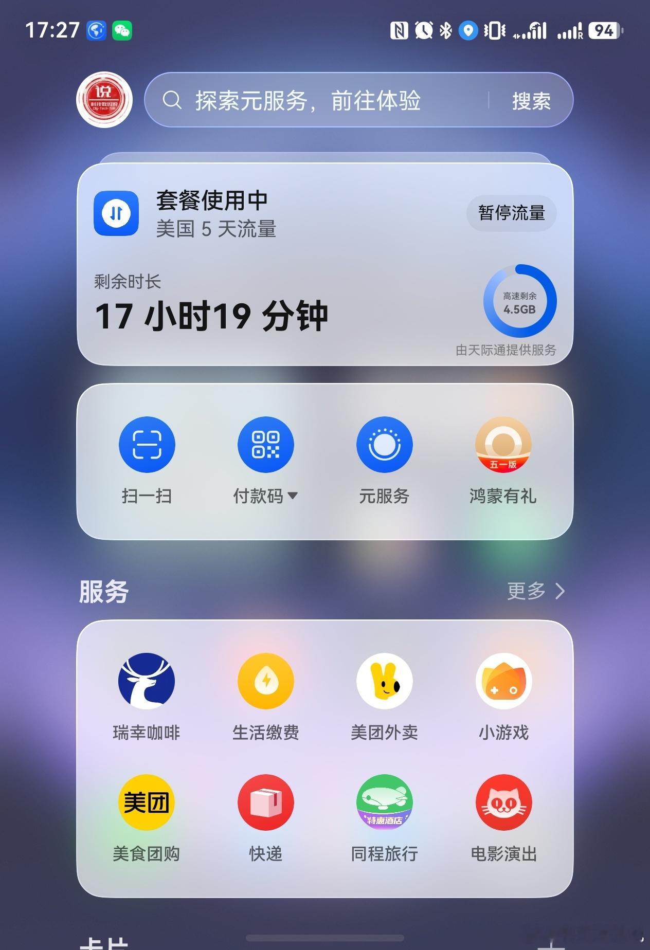 这次我用华为Pura X Max天际通开的5天100元的流量套餐,每天5G高速流量,负一屏直接有显示,挺直接的,用完了就是慢速的。反正昨天第一天没用完,因为出去主要就是导航这些用不了多少,回来酒店有WIFI,一天5G都用不完,但是我才发现我的IP咋变泰国去了